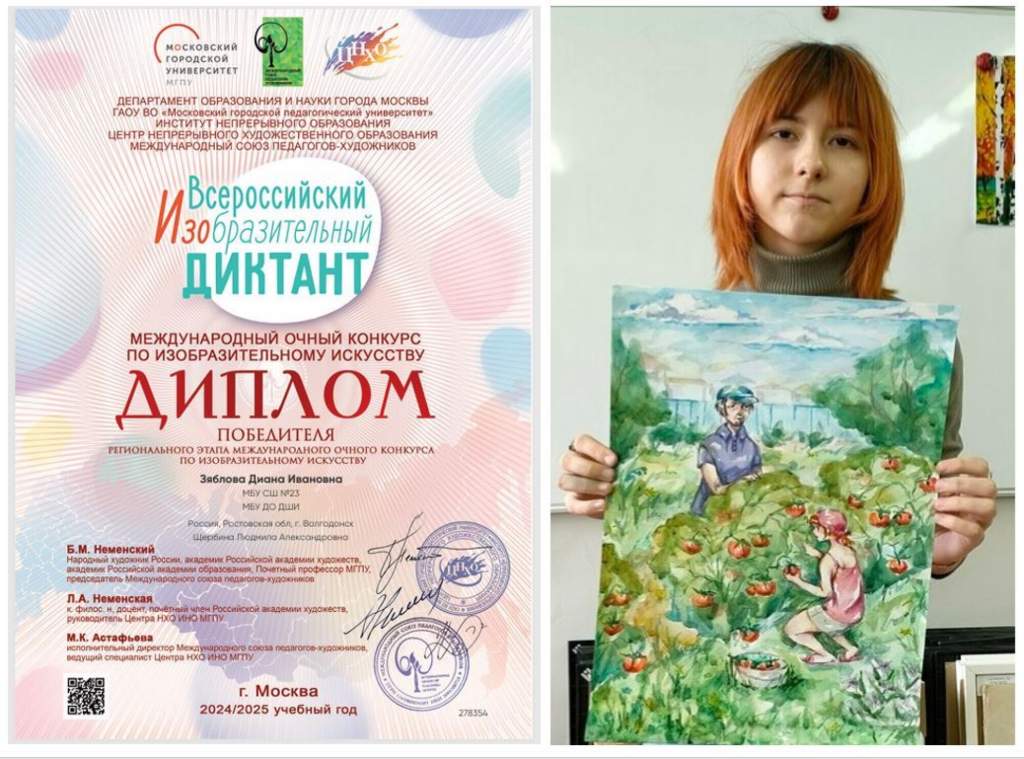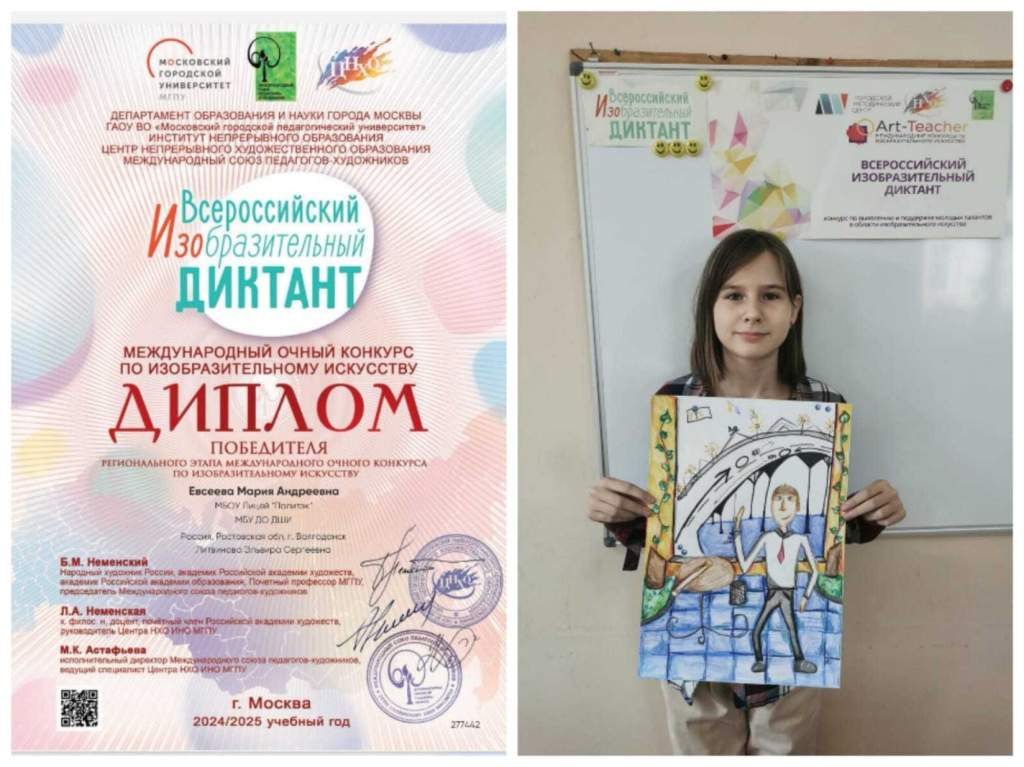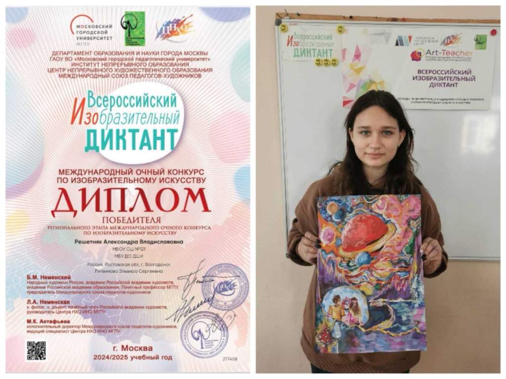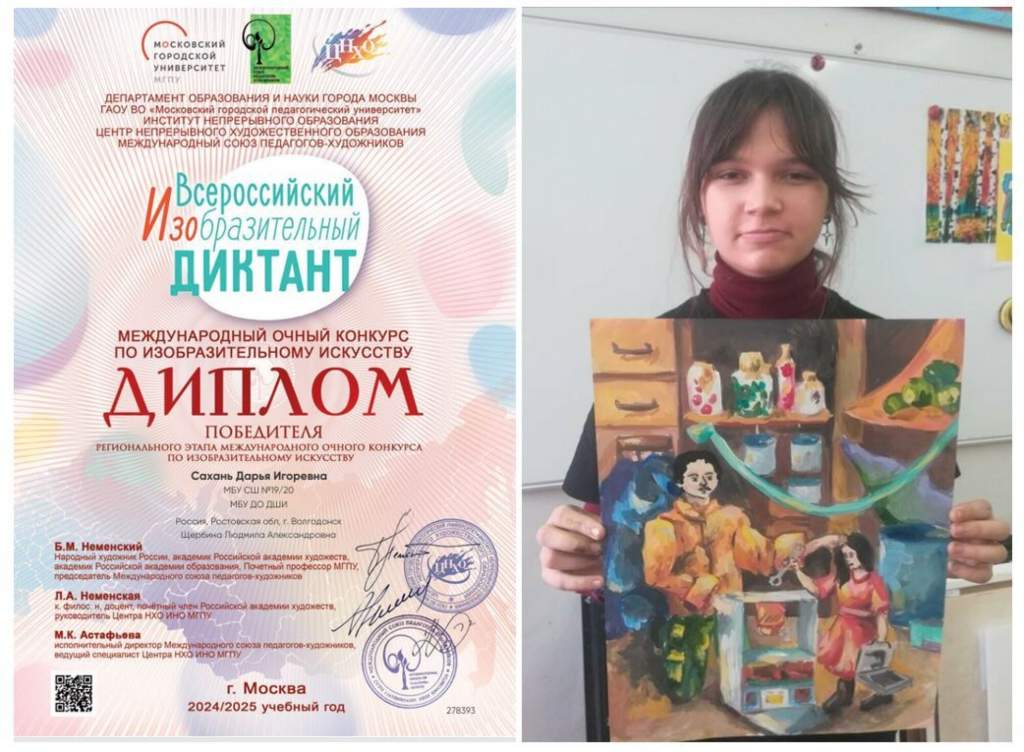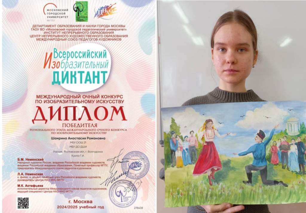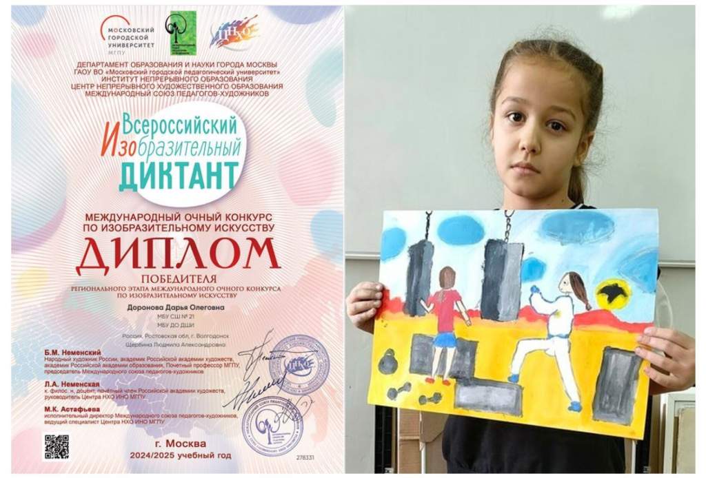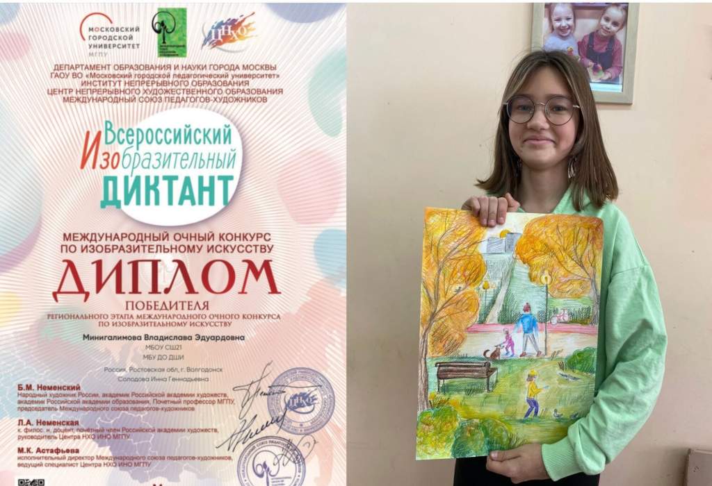 В конце ноября 2024 года в России прошел Всероссийский изобразительный диктант, в котором приняли участие ученики Детской школы искусств (ДШИ) и Детской художественной школы (ДХШ) Волгодонска. Этот проект проводится ежегодно при поддержке Международного союза педагогов-художников и направлен на выявление и поддержку молодых талантов в области изобразительного искусства.