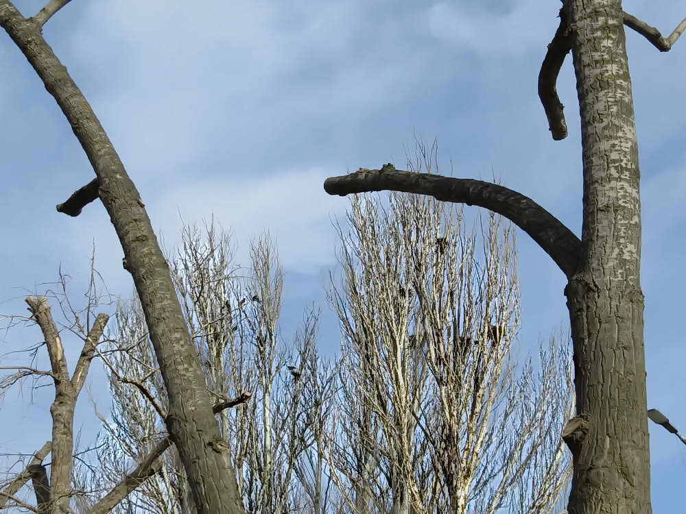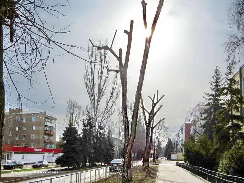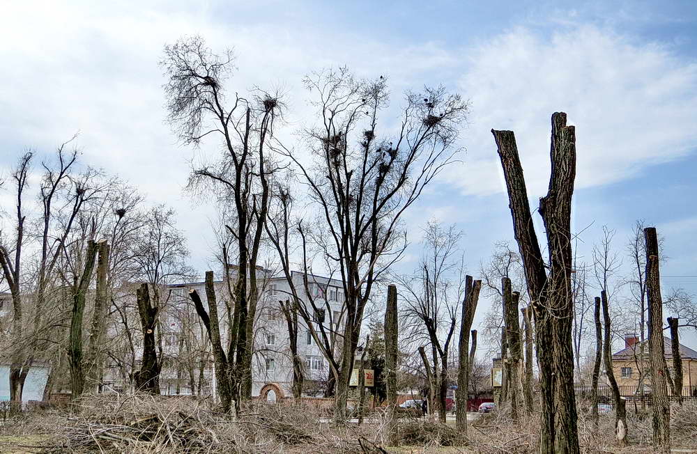 Конечно, обрезание крон деревьев под «столб» совсем не украшает улицы города. Но месяц, другой и всё покроется листвой и новыми побегами. Но особенно раздражают горожан и жителей домов, где на деревьях обосновались «волгодонские соловьи»- грачи..