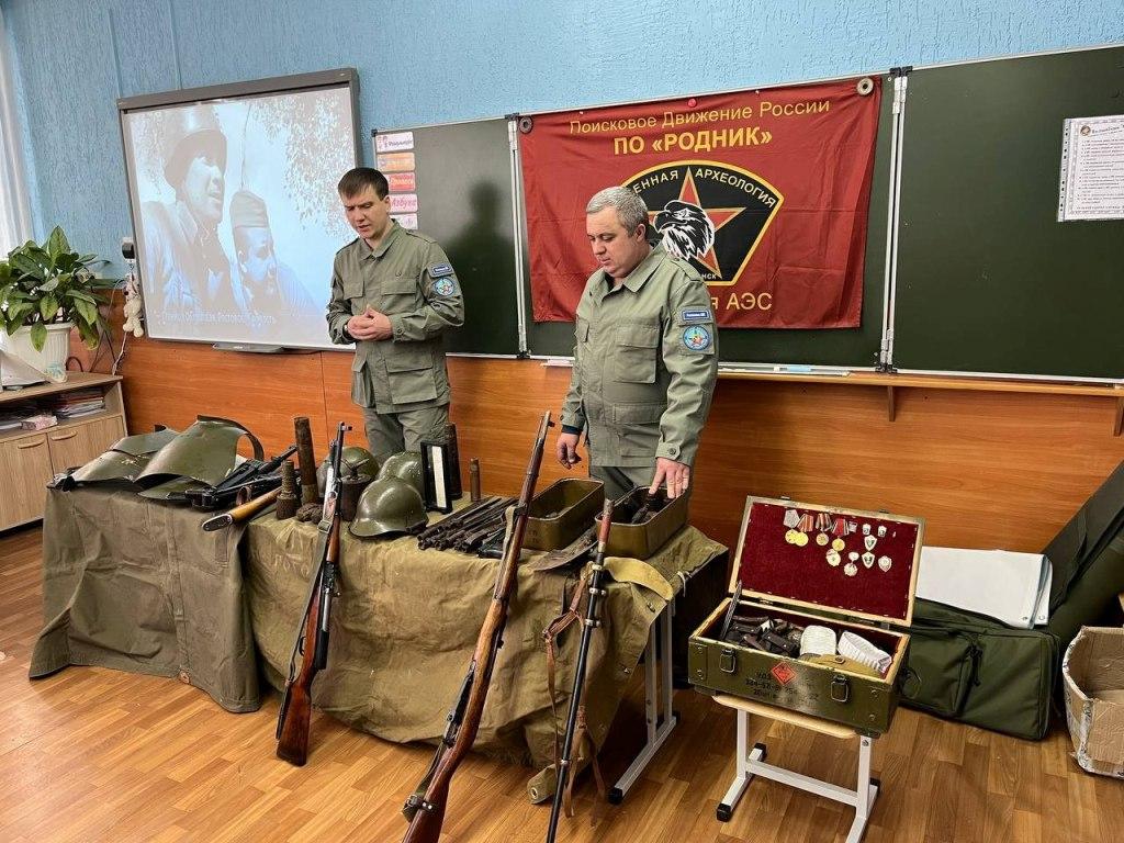 Для школьников была организована экспозиция военных находок, макетов снаряжения и экипировки времен Великой Отечественной войны. Подлинные предметы прошлого, которые нашли поисковики «Родника» во время раскопок на местах сражений, вызвали особенный интерес у лицеистов. Это дало возможность школьникам прикоснуться к великой истории страны, почувствовать атмосферу времени и проникнуться уважением к ратному подвигу солдат Победы.