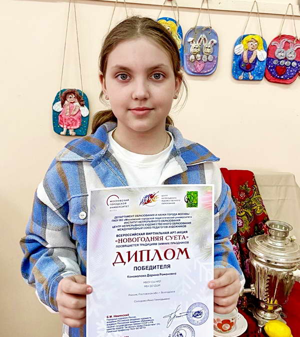 Мы сердечно поздравляем Дарину Коновалову с победой и желаем ей дальнейших творческих успехов, новых вдохновляющих идей и незабываемых достижений в мире искусства! Отдельного поздравления заслуживает её преподаватель, Инна Солодова, которая внесла огромный вклад в развитие таланта своей учениц. Желаем Инне Геннадьевне новых творческих побед и успехов в воспитании юных талантов!