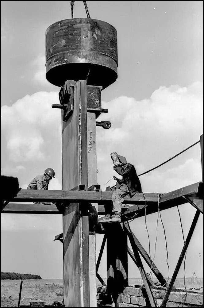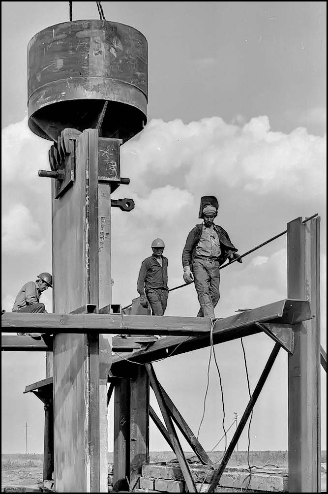 И вот эта конструкция в земле. Очень просто, по-будничному происходила ее установка. Но праздник был в душе каждого из работающих здесь специалистов: начальника участка В. Хохлова, сварщика В. Лобачега, крановщика П. Пермякова, монтажника М. Шульца. Их радость понятна — ведь с этой первой шпунтины начинается еще одна строка в летописи великой стройки на берегу рукотворного моря.