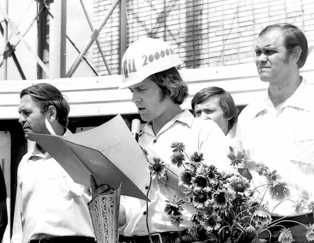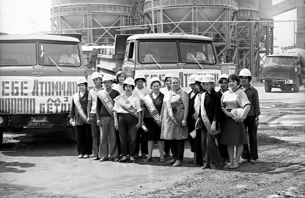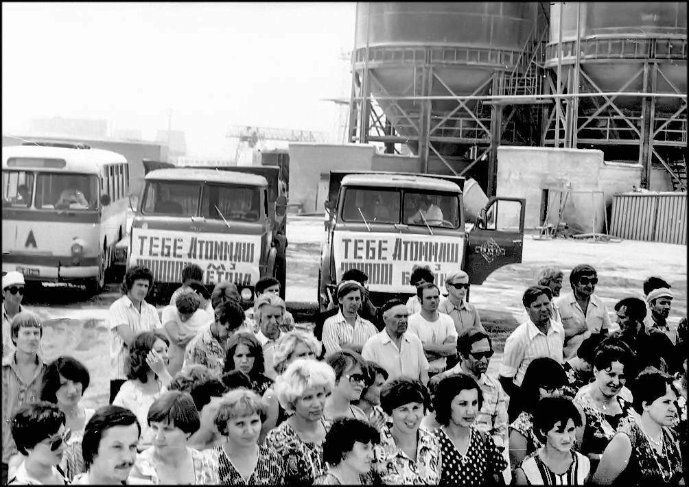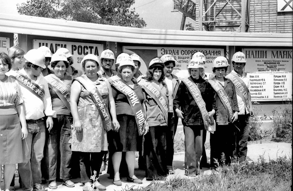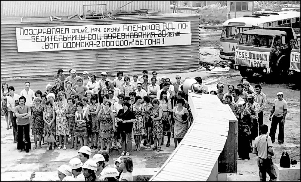 На большом бетонном заводе треста «Волгодонскэнергострой» 19 июля выпущен двухмиллионный кубометр бетона. Митинг, посвященный этому событию, открывает секретарь партбюро завода С.В. Макренко. На почетный круг выходят победители социалистического соревнования за первое полугодие. На ярко-желтых касках начертано: смена № 2. 2000000!