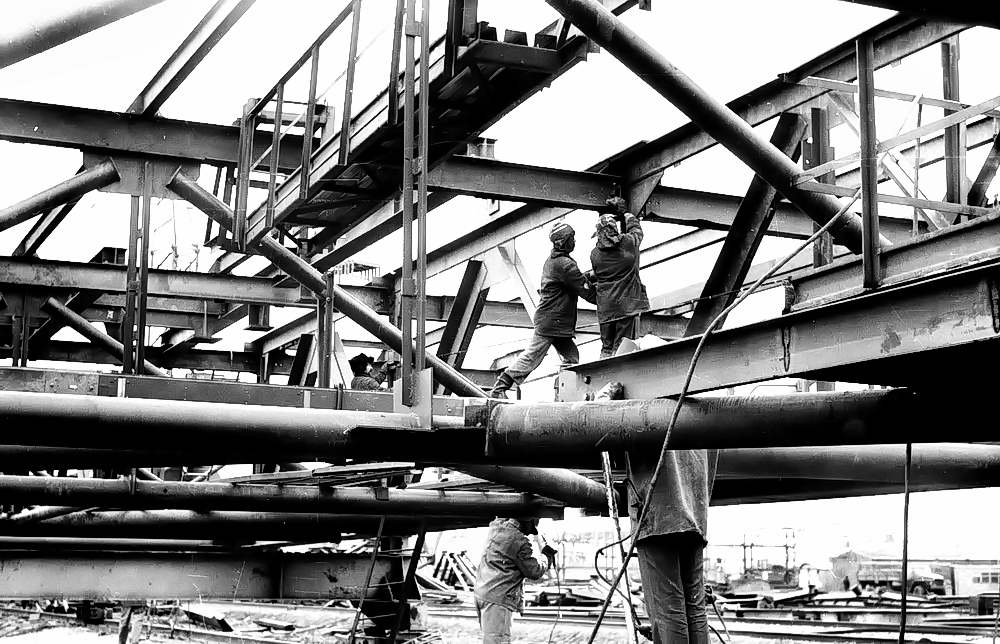 На снимке: передовые монтажники звена С.А.ФАДЕЕВ, М.Д.ШЕВЧЕНКО, Ю.А.ПЕТРОВ, А.М.СТАСЕНКО . Фото А. Тихонова.