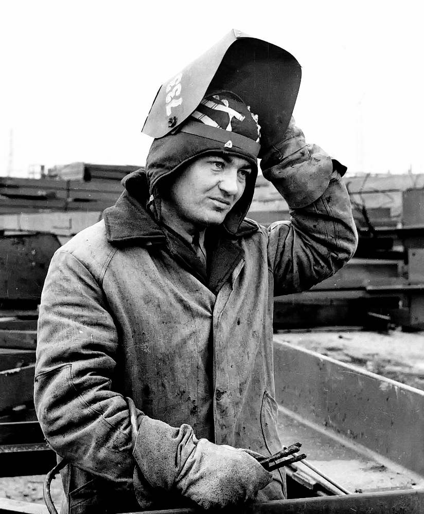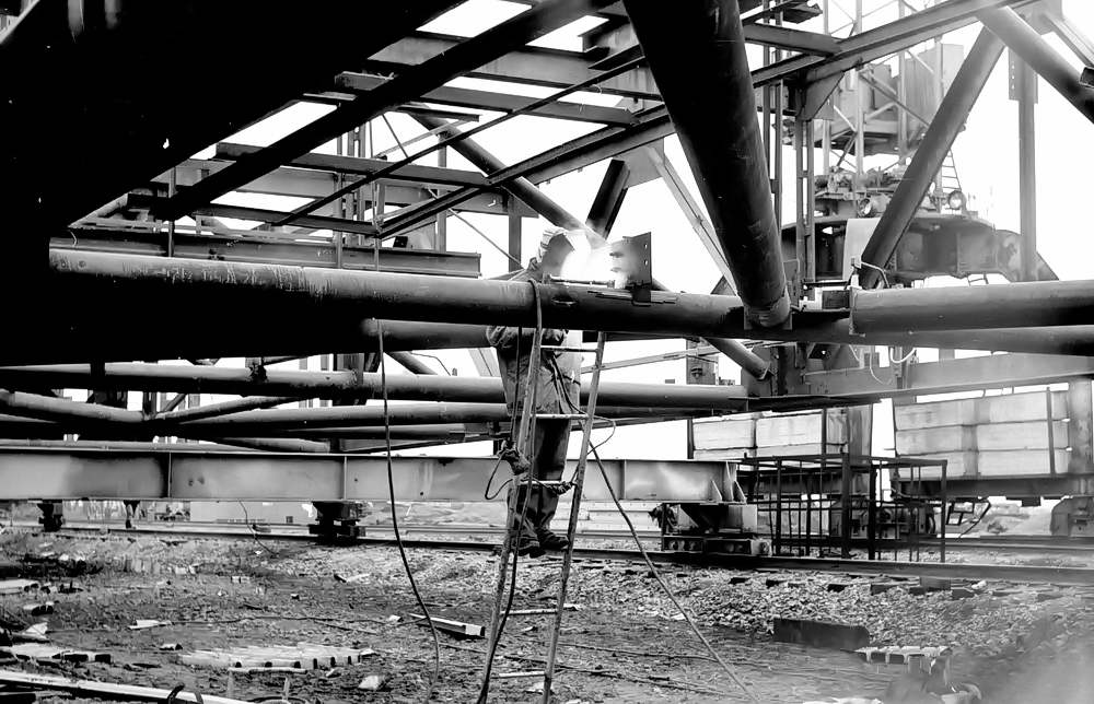Ударно трудится в дни 100-суточной вахты на укрупнении ферм с консолям и блоков покрытии пролетов корпуса N 4 бригадир сварщиков из МУ-27 «Спецстальконструкции» А.Г. МИЗИН (на снимке). Фото А . Тихонова.