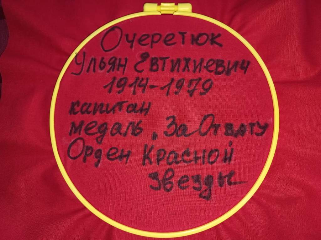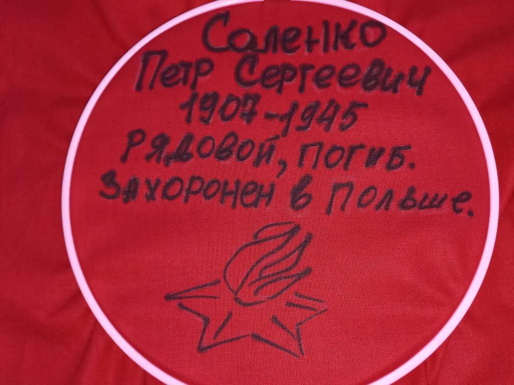 «Мой дед Пётр Сергеевич Соленко погиб в Польше в начале 1945 года, был танкистом и сгорел в танке. Похоронен в Польше. У нас нет возможности побывать там, но мы очень надеемся, что захоронение находится в порядке. Второй дед – Ульян Евтихиевич Очеретюк – вернулся с фронта., Он был капитаном, политруком авиационного полка, награждён медалью «За отвагу» и орденом Красной Звезды. После войны был преподавателем русского языка и литературы. Мы помним и гордимся своими дедами».