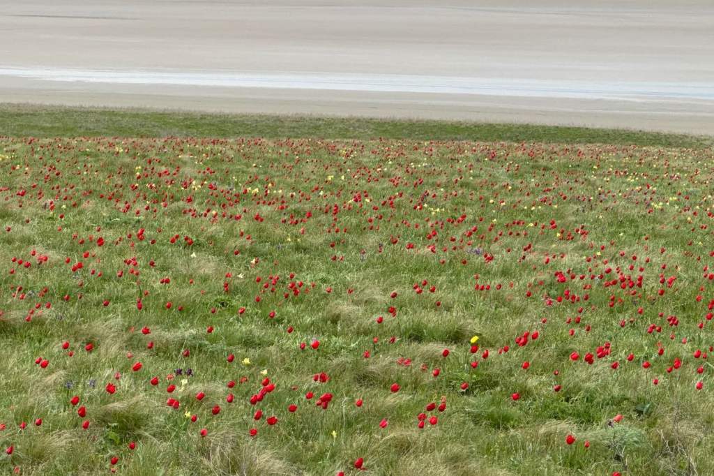 На берегу озера Лопуховатого в сопровождении инспекторов заповедника посетители любовались цветущей степью, полями тюльпана душистого, тюльпана Биберштейна, касатика низкого и других растений.