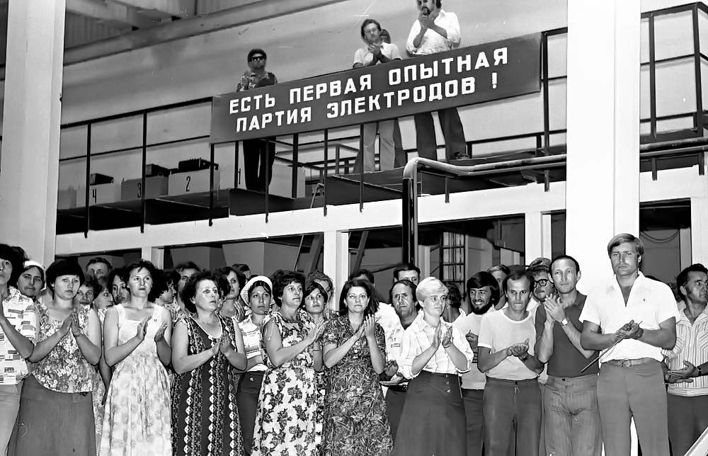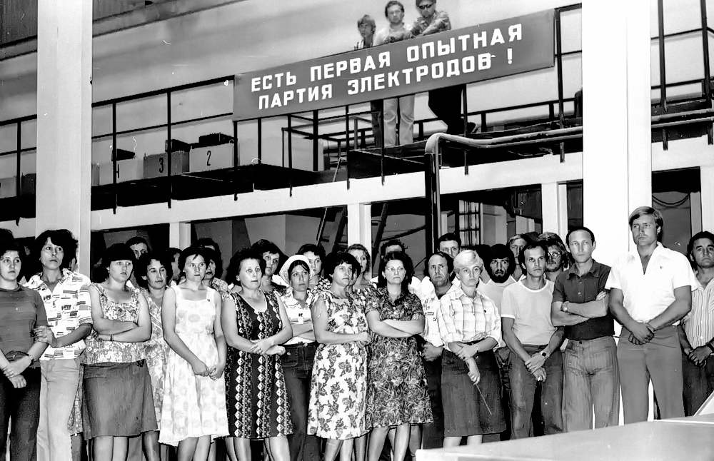 По этому поводу в шестом корпусе состоялся митинг. Главный инженер «Атоммаша» С. Елецкий поздравил эксплуатационников с успешным выпуском опытной партии электродов и сообщил, что в четвертом квартале коллектив шестого корпуса должен бороться за выпуск первой сотни тонн уже опытно-промышленных электродов.