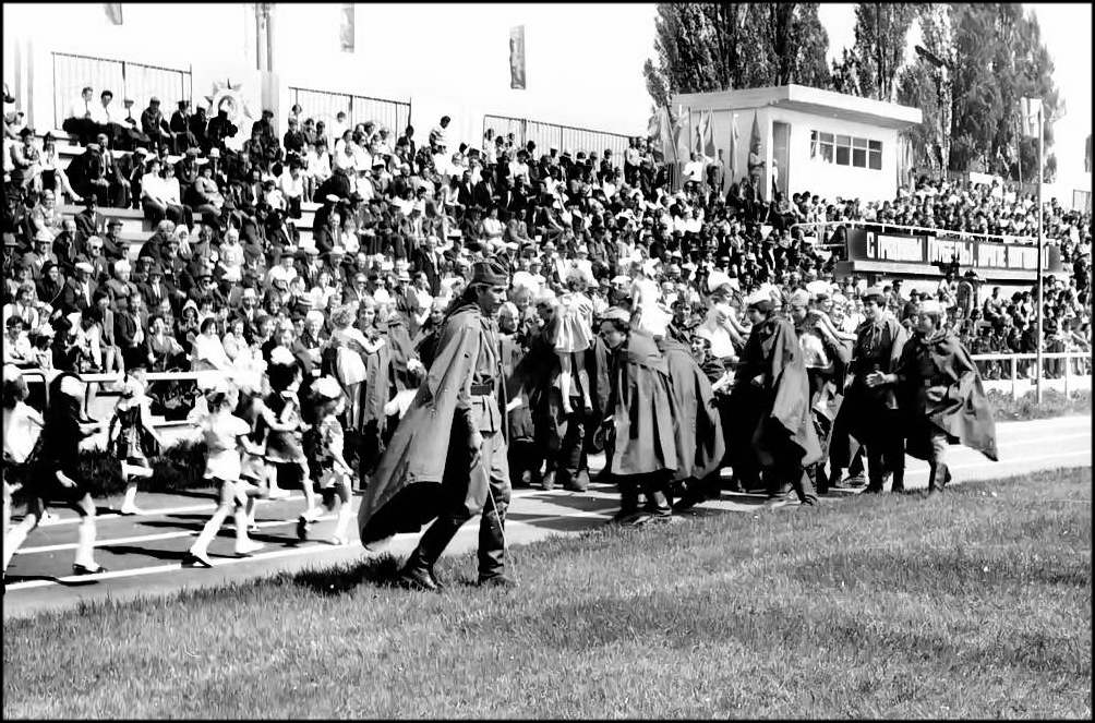 Трижды звучит оружей ный залп. Десятки голубей вздымаются в небо. Нам нужен мир! Мир, чтоб трудиться, смеяться, мечтать и улыбаться. Под марш духовых оркестров колонна ветеранов направляется на стадион, где состоялся большой театрализованный праздник.