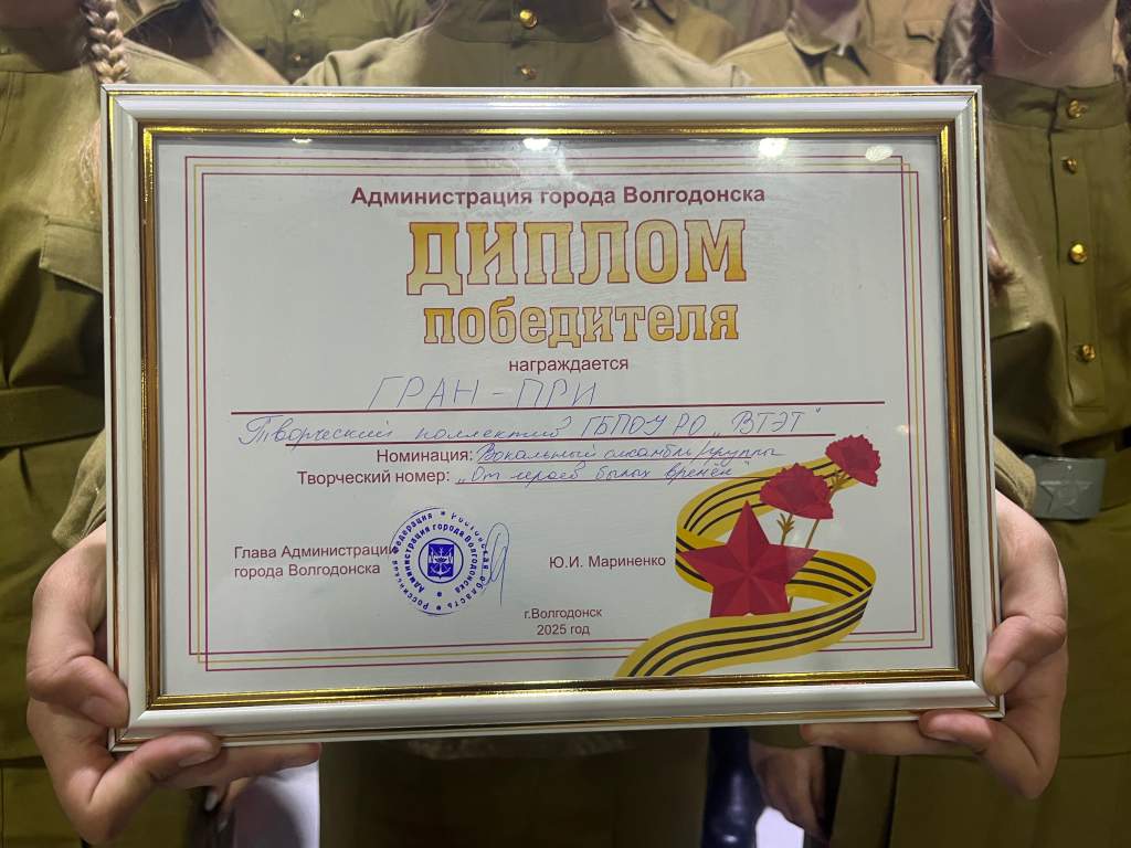 - Гран-при: Творческий коллектив ВТЭТ с песней «От героев былых времён». В семьях большинства из 49 участников хора есть свои герои. Их имена они увековечили на алых лоскутах «Полотна Победы». Песню, с которой выступали, студенты ВТЭТ готовили больше двух месяцев и постарались вложить в неё всё, чему научили педагоги и что сумели прочувствовать сами. В результате — высшая оценка.