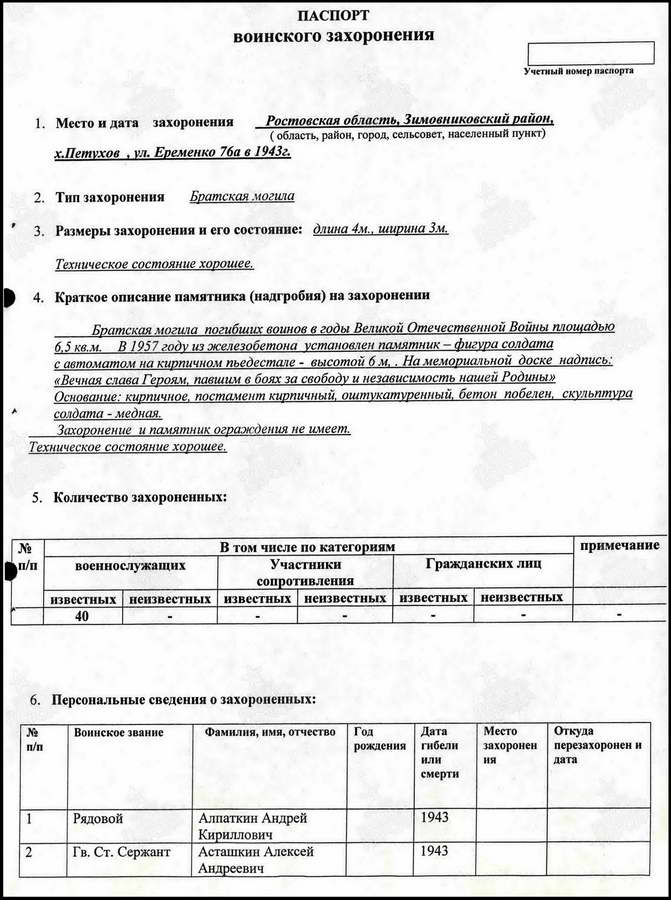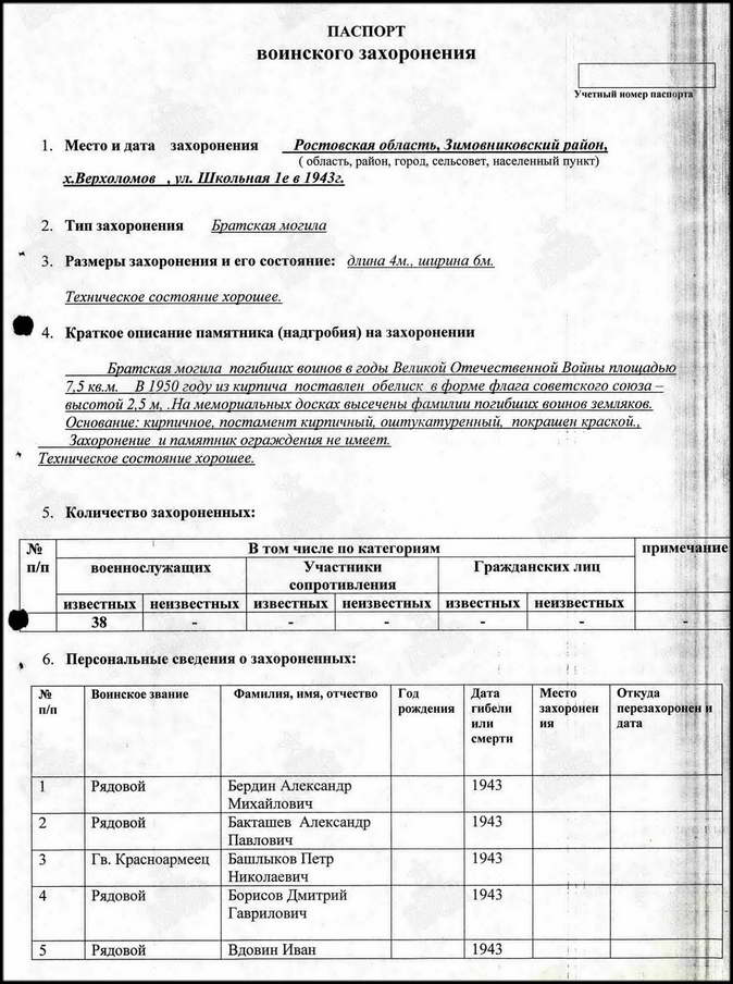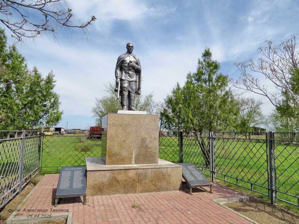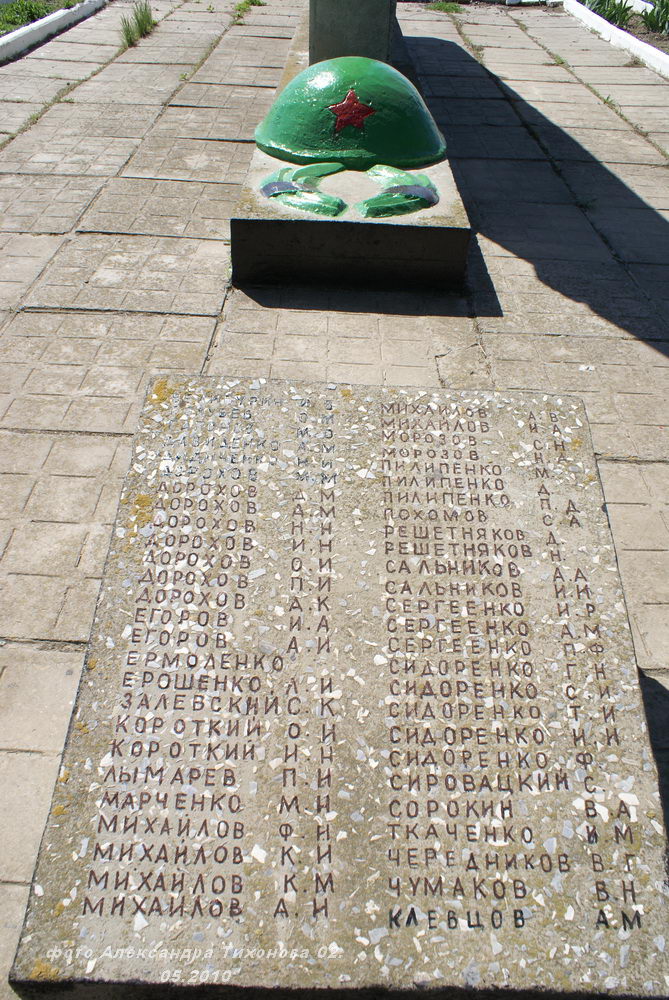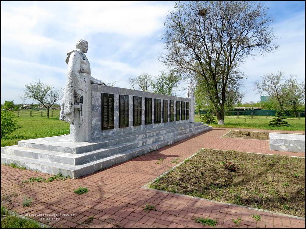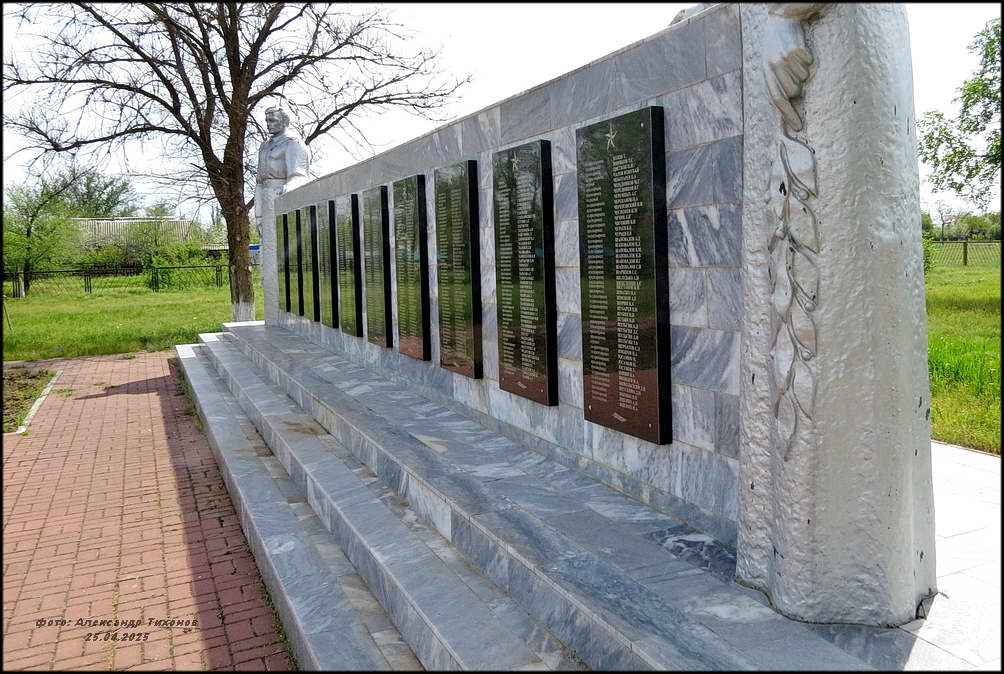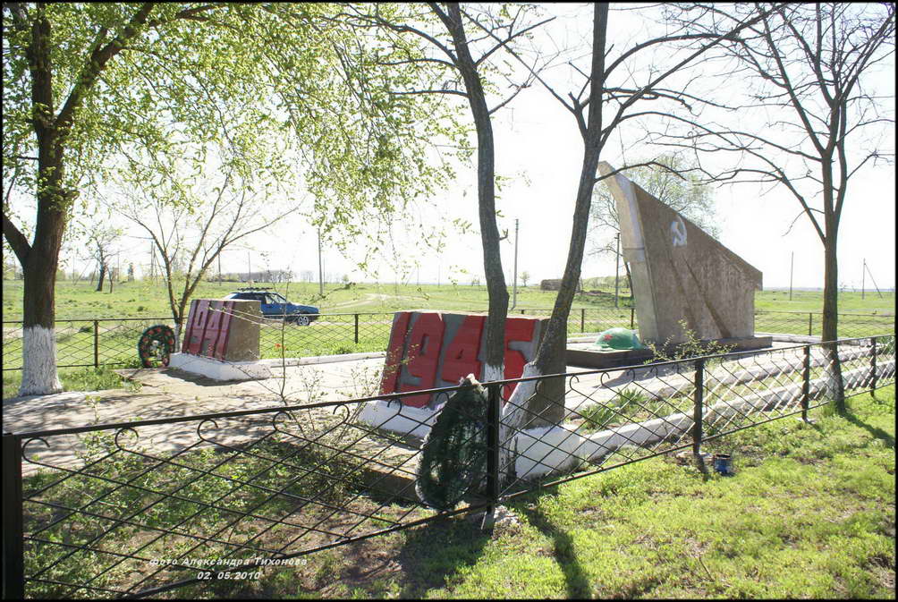 Но вот память о павших в боях Великой Отечественной войны за хутор чтят свято. Братская могила воинов Красной Армии в хорошем состоянии. После проведённой реставрации и ремонта здесь на братской могиле вместо неприметного обелиска установлен величественный памятник. Сколько здесь захоронено точно неизвестно. В списке 68 имён, чьи имена известны (на 2014 г), хотя на мемориальных плитах их в два раза больше.