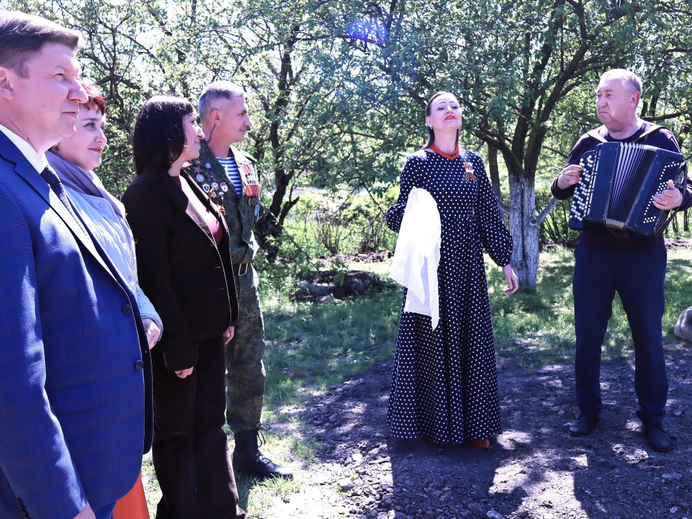Еще одну табличку установили на доме в Красном Яру, где проживает Михаил Шевченко. Ветерану в этом году исполнится 100 лет. Он был призван в армию в ноябре 1942 года, служил на Дальнем Востоке в артиллерийском дивизионе дальномерщиком, отражая атаки японской авиации на маньчжурской границе. Прошел с боями всю Корею. Для Михаила Ивановича артисты исполнили любимые фронтовые песни — «Казаки в Берлине», «Синий платочек» и «День Победы».