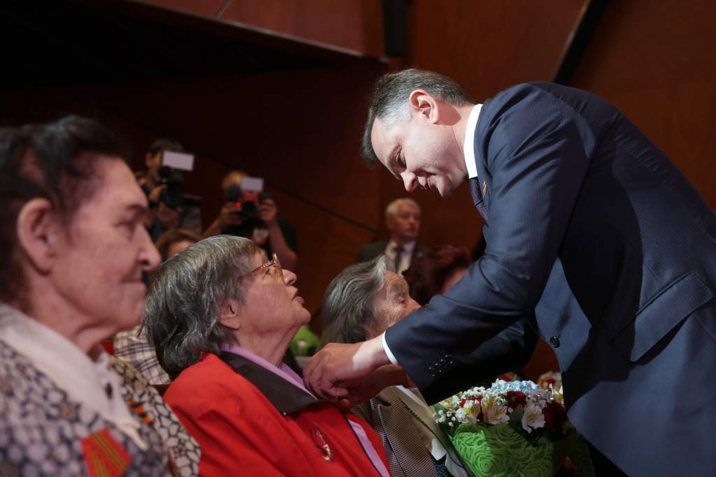 «За вашими плечами – целая эпоха: тяжелейшая война и послевоенное восстановление страны. Вы выстояли и победили! Низкий поклон вам за ратный и мирный труд, за вашу мудрость и преданность Родине! Мы перед вами в неоплатном долгу. Поздравляю вас с юбилеем Великой Победы! Желаю крепкого здоровья, бодрости духа, мира и благополучия вашим близким», — сказал Юрий Слюсарь.