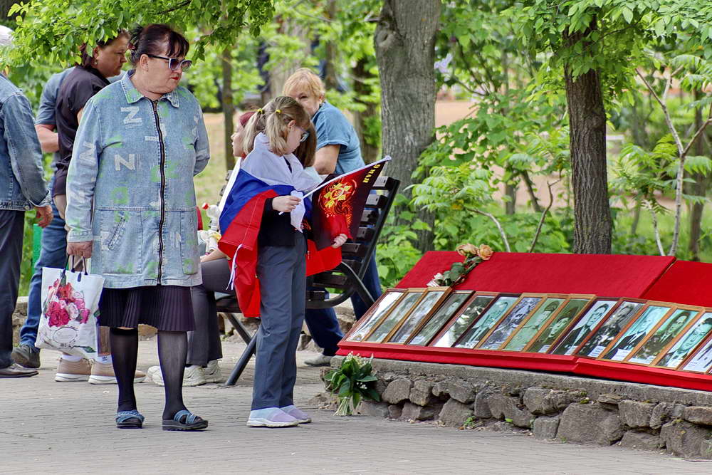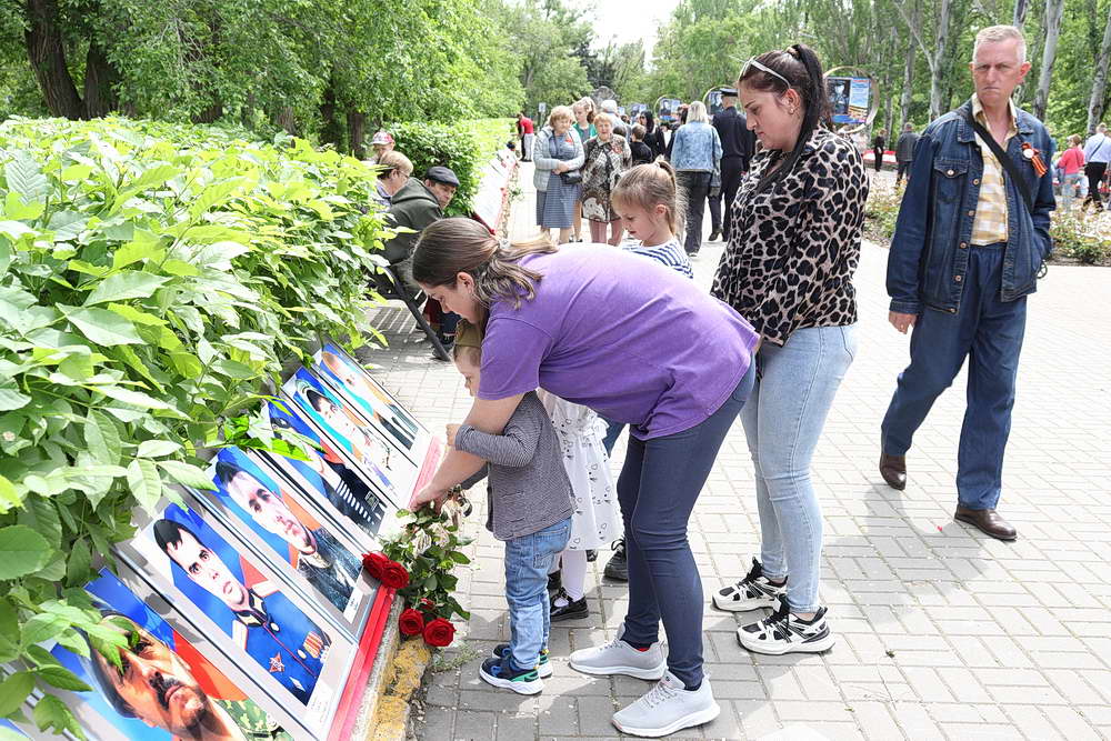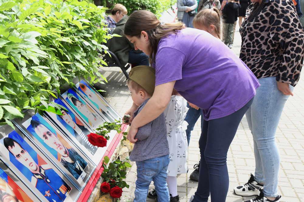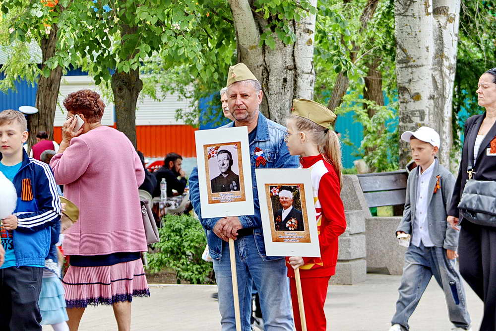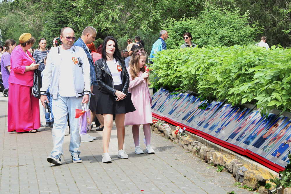 В это время, в другом месте города – в парке Победы – бурлила жизнь всенародного праздника. Главным событием парка стала уникальная выставка-галерея портретов. На специально оформленных стендах были представлены фотографии военных лет – портреты героев Великой Отечественной войны, храбро защищавших Родину от врага. Рядом с ними, на противоположной стороне алееи были размещены портреты воинов современной специальной военной операции – их лица, полные мужества и решимости, стали продолжением этой великой традиции защиты Отечества.