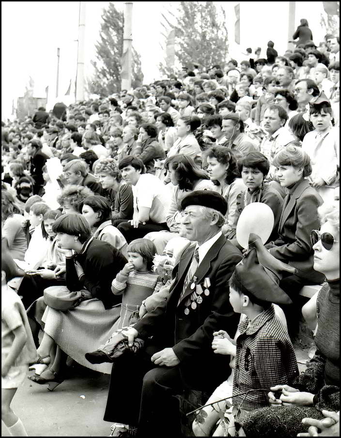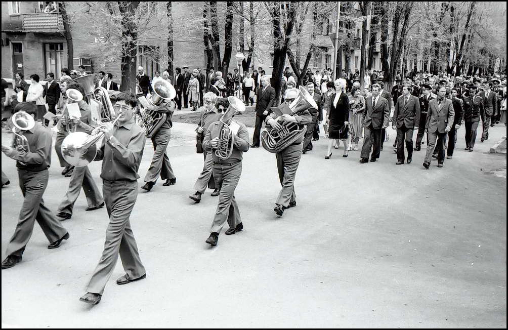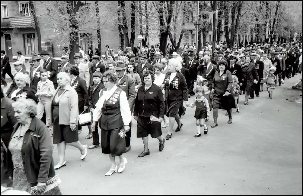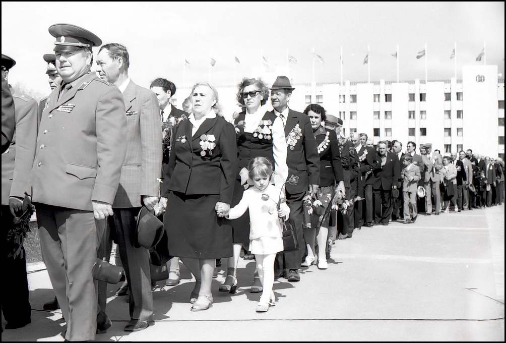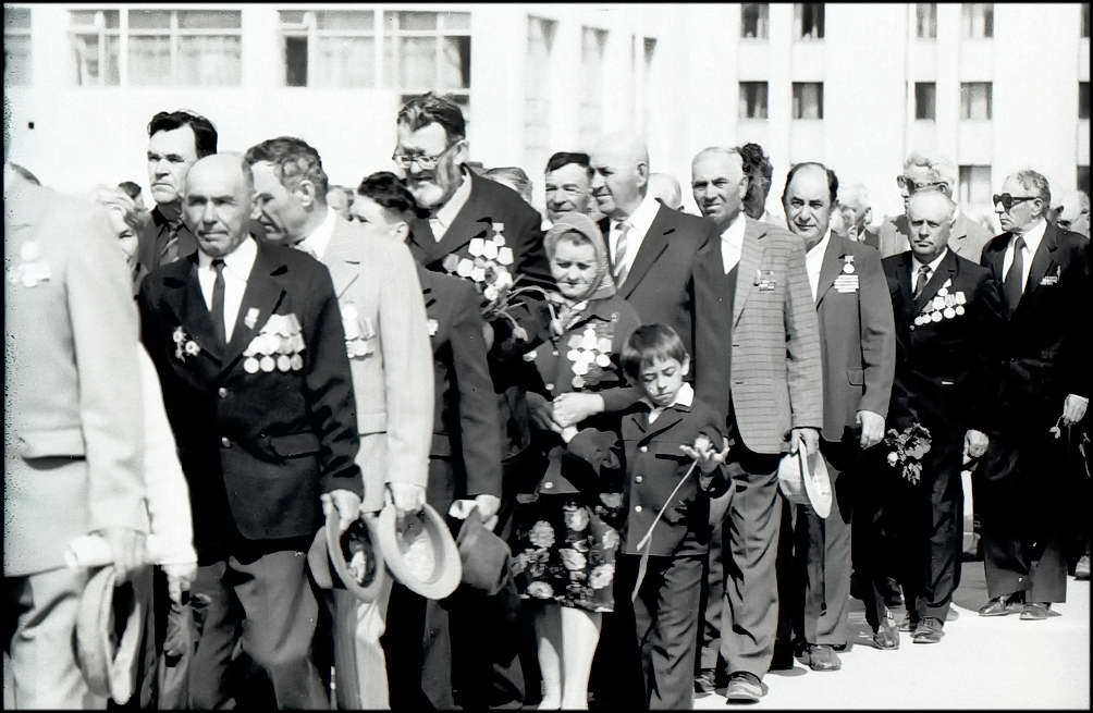 Ветераны Великой Отечественной войны построились в колонку на улице 30 лет Победы. И, когда колонна двинулась по улице Лекина к площади Победы, на всем пути ее приветствовали пионеры. Они отдавали ветеранам пионерский салют, дарили цветы. Бывшие солдаты шли по существу в живом людском коридоре -столько народу было в этот час на улице.