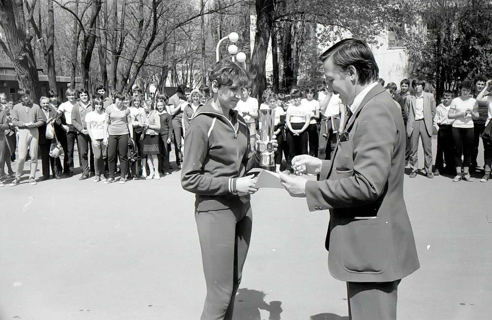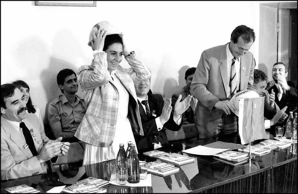 В. Виноградов передал первому секретарю ЦК ДКСМ Станке Шоповой переходящий приз для вручения лучшей комсомольско — молодежной бригаде города-побратима Долни-Дыбника.