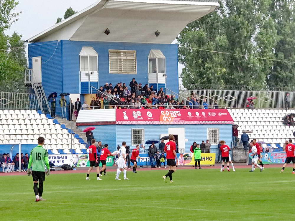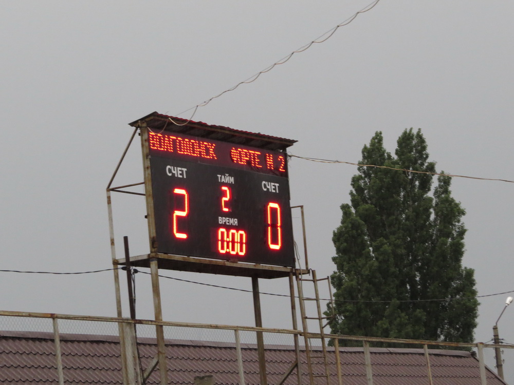 Футбольный клуб «Волгодонск» принимал гостей из города Таганрога — команду «Форте-М». Первый тайм прошёл при пасмурной погоде, но без дождя. Волгодонцы сумели забить два мяча в ворота соперников. Отличились Бачурин и Иванов. А вот во втором тайме пошёл дождь, и футболистам обеим команд пришлось нелегко. Где-то в середине второго тайма волгодонцы закрепили свой успех, забив усилиями Замчалова третий — победный — гол.