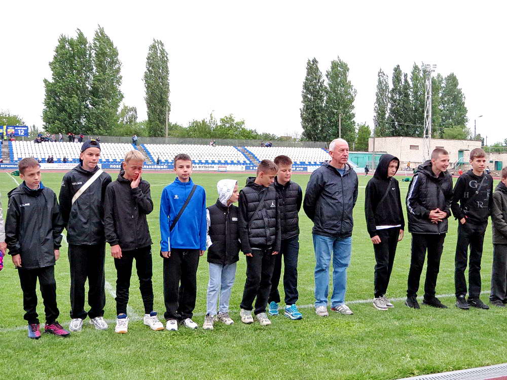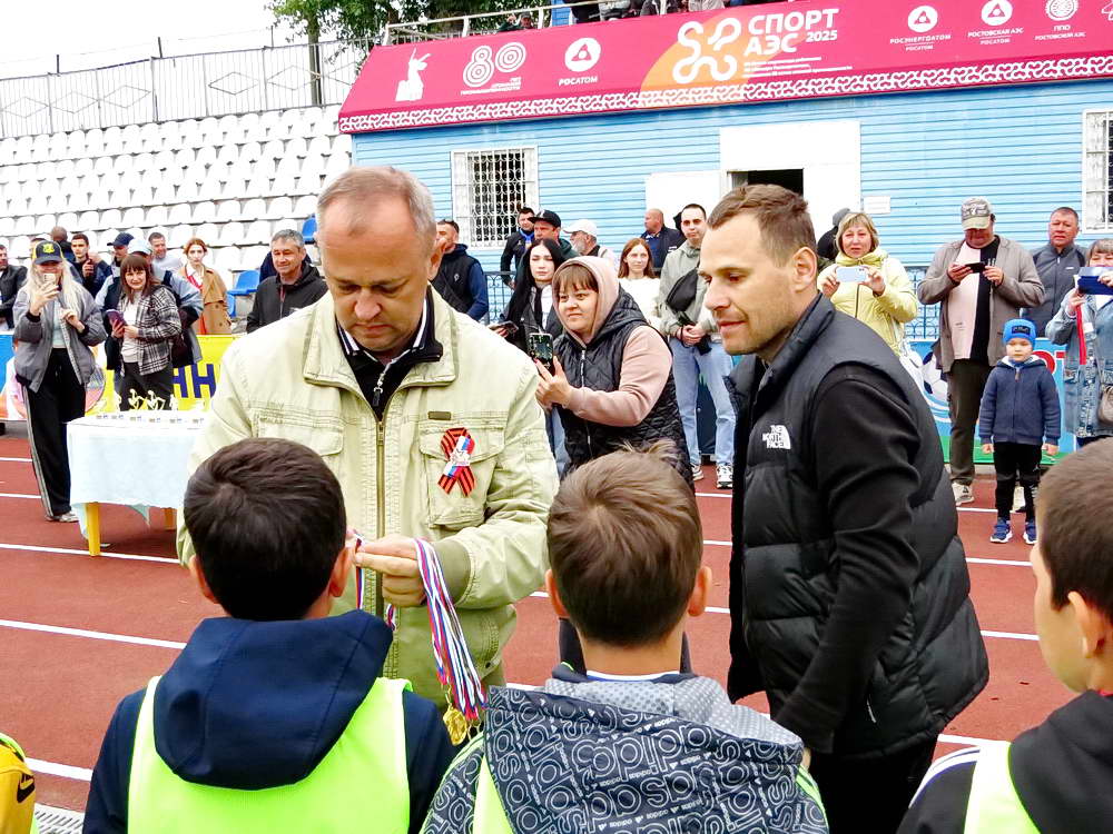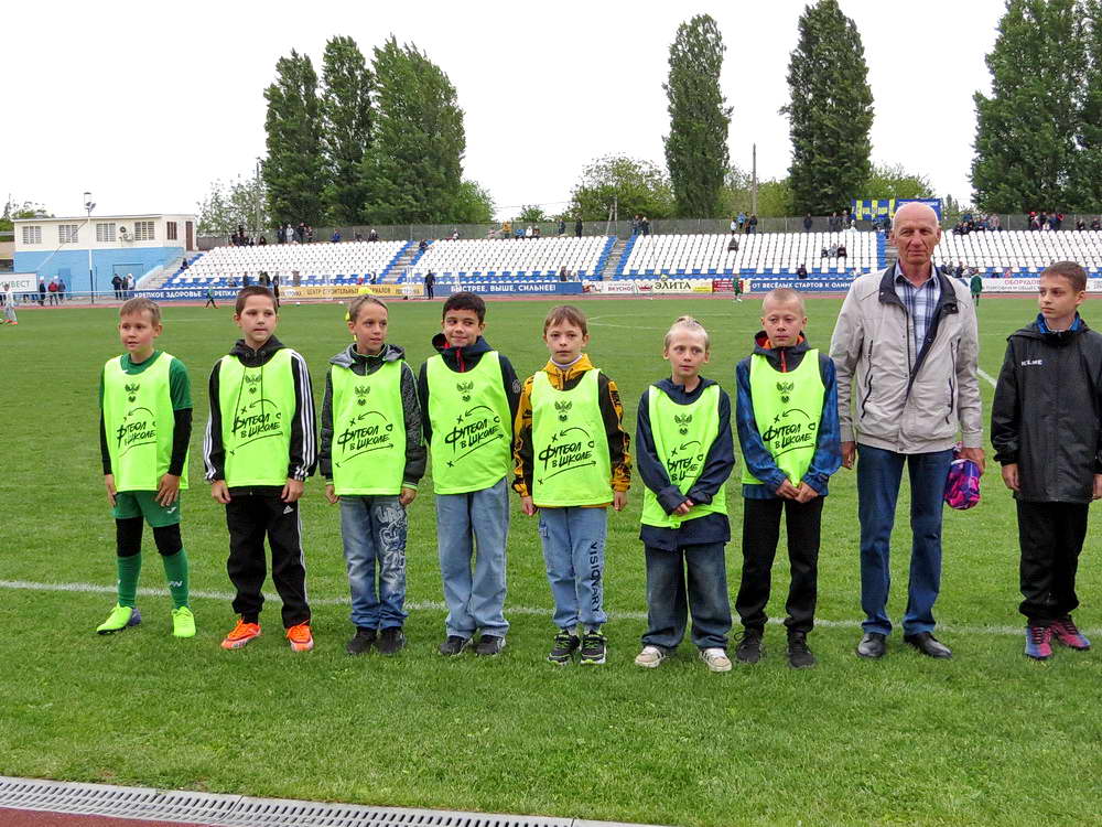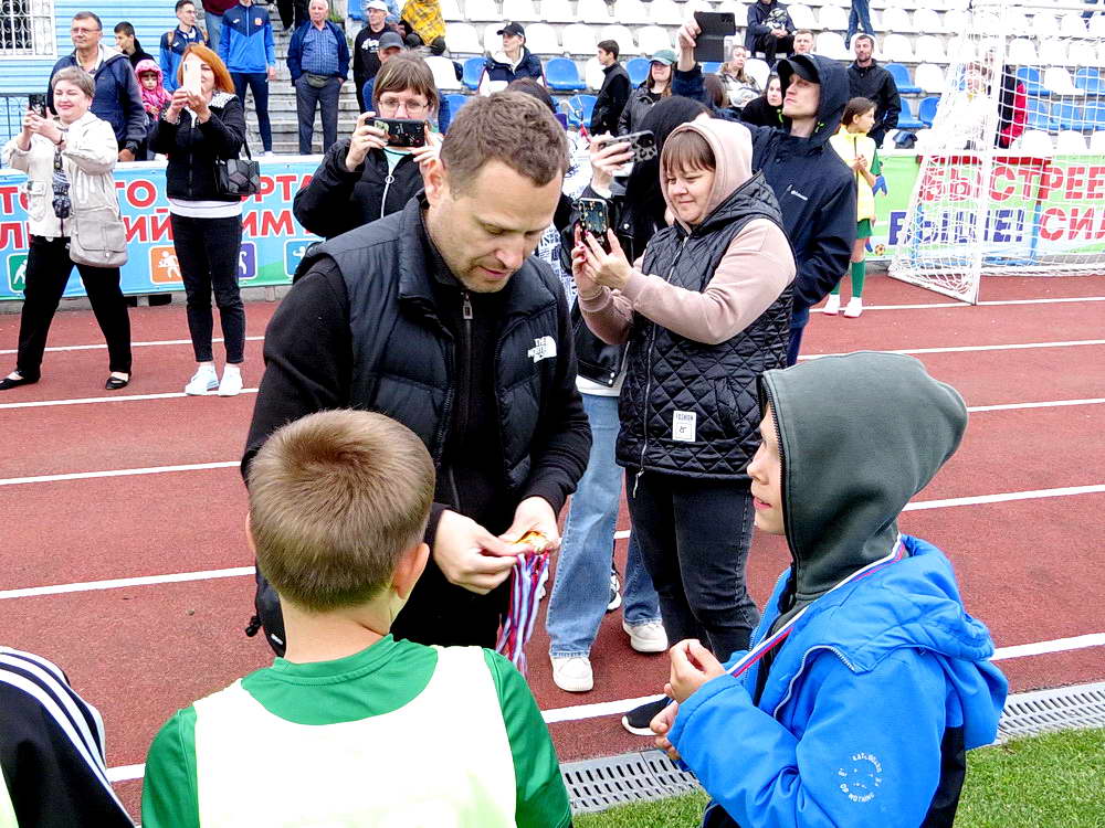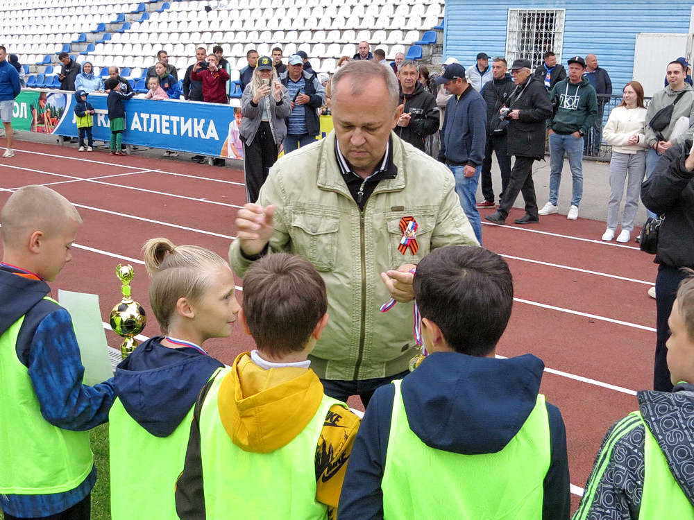 В перерыве игры между командами футбольных клубов «Волгодонск» и «Форте-М» (Таганрог) победители городского турнира «Кожаный мяч» выстроились перед центральной трибуной футбольного поля где им и были вручены медали победителей.