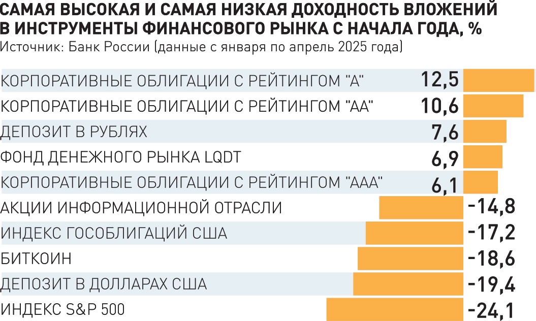 «В целом с начала 2025 года наибольшую доходность среди российских инструментов показали корпоративные облигации с кредитными рейтингами «АА» и «А» (10,6 и 12,5% соответственно)», — пишет Банк России в свежем выпуске «Обзора рисков финансовых рынков». Фонды денежного рынка и рублевые депозиты за первые четыре месяца нынешнего года показали доходность на уровне 6,9 и 7,6% соответственно.