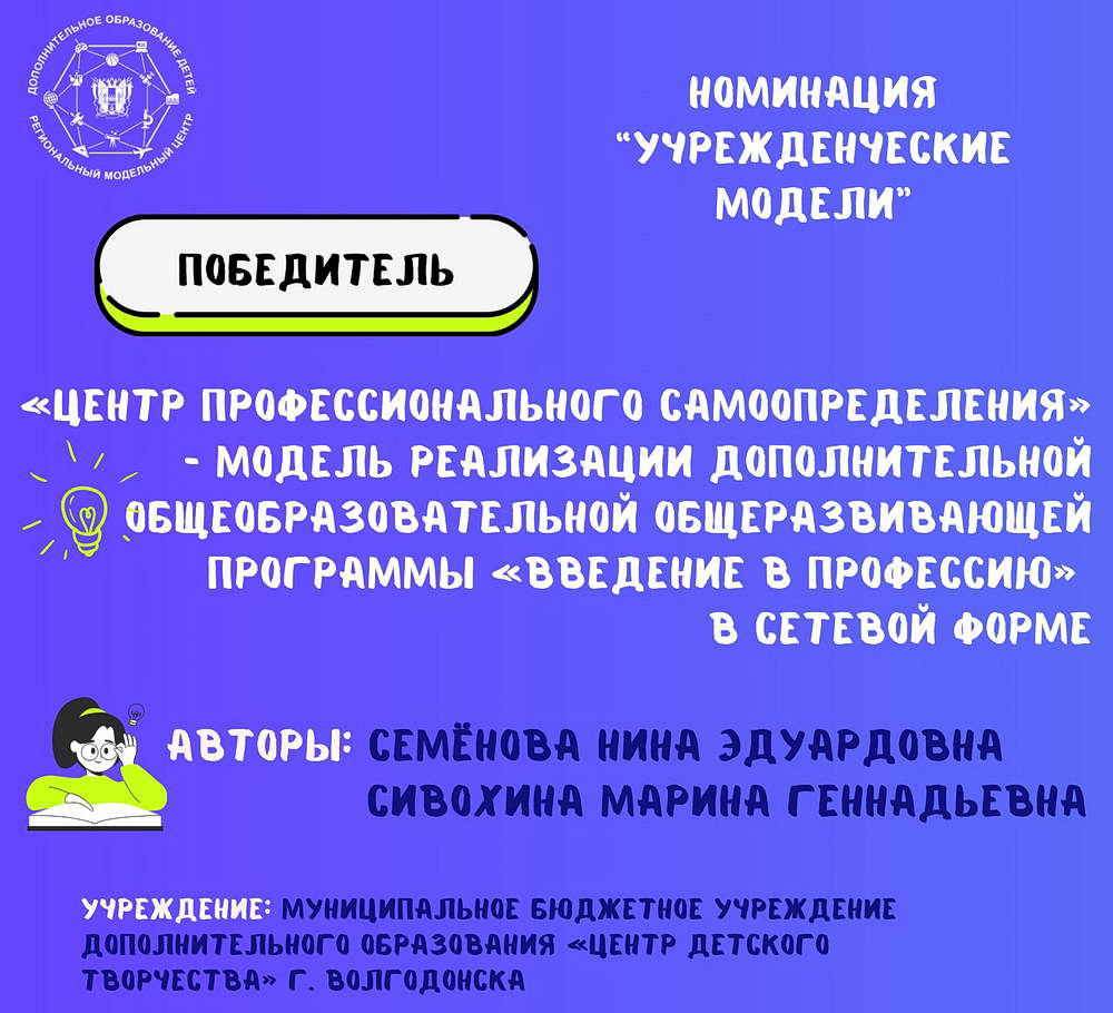По итогам всех этапов конкурса победителем в номинации «Учрежденческие модели» стала именно модель «Центр профессионального самоопределения подростков» МБУДО «Центр детского творчества», представляющая реализацию программы «Введение в профессию».