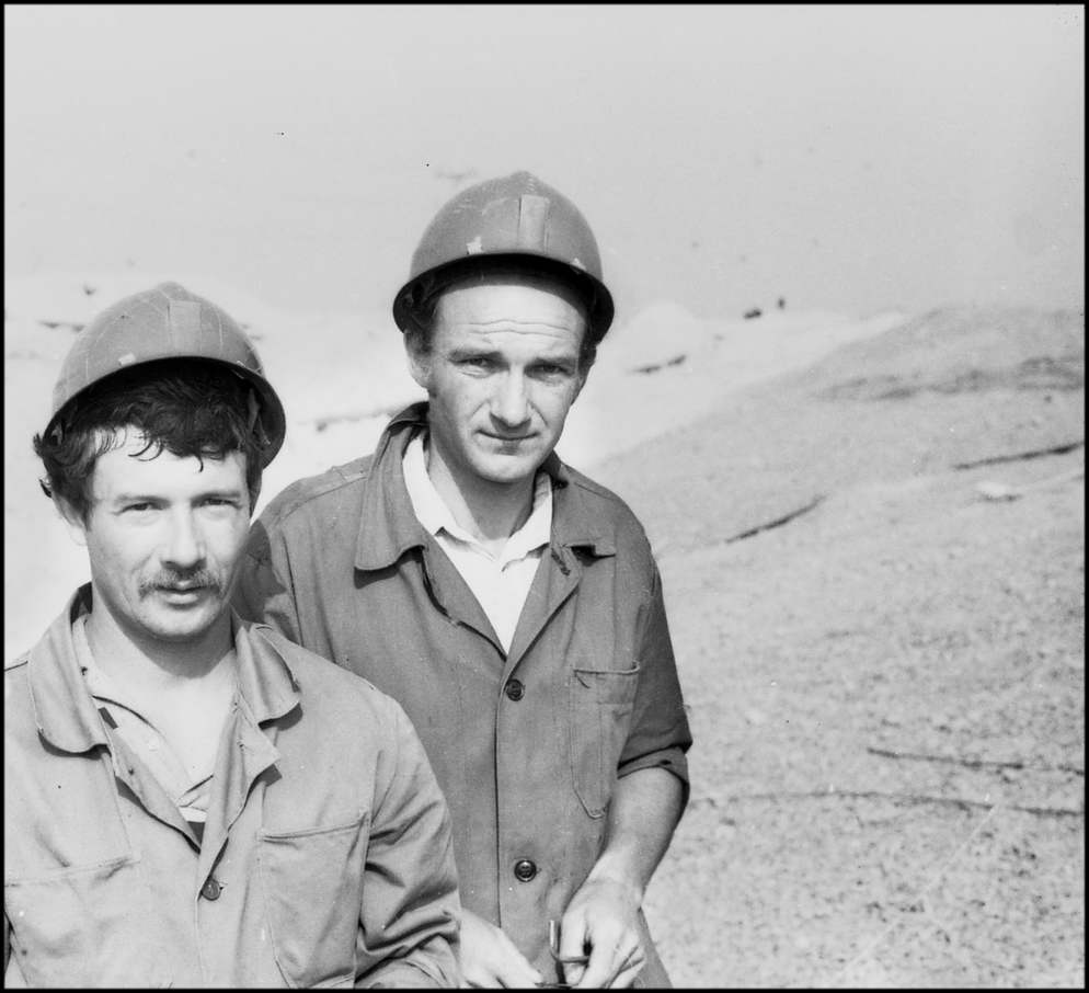 УДАРНО ТРУДЯТСЯ НА УКЛАДКЕ БЕТОНА В ТЕЛО ПЛОТИНЫ ПРУДА — ОХЛАДИТЕЛЯ РОСТОВСКОЙ АЭС ПЛОТНИК-БЕТОНЩИК К. КАРИМОВ И МОНТАЖНИК Е. ПАРХОМЕНКО (НА СНИМКЕ).