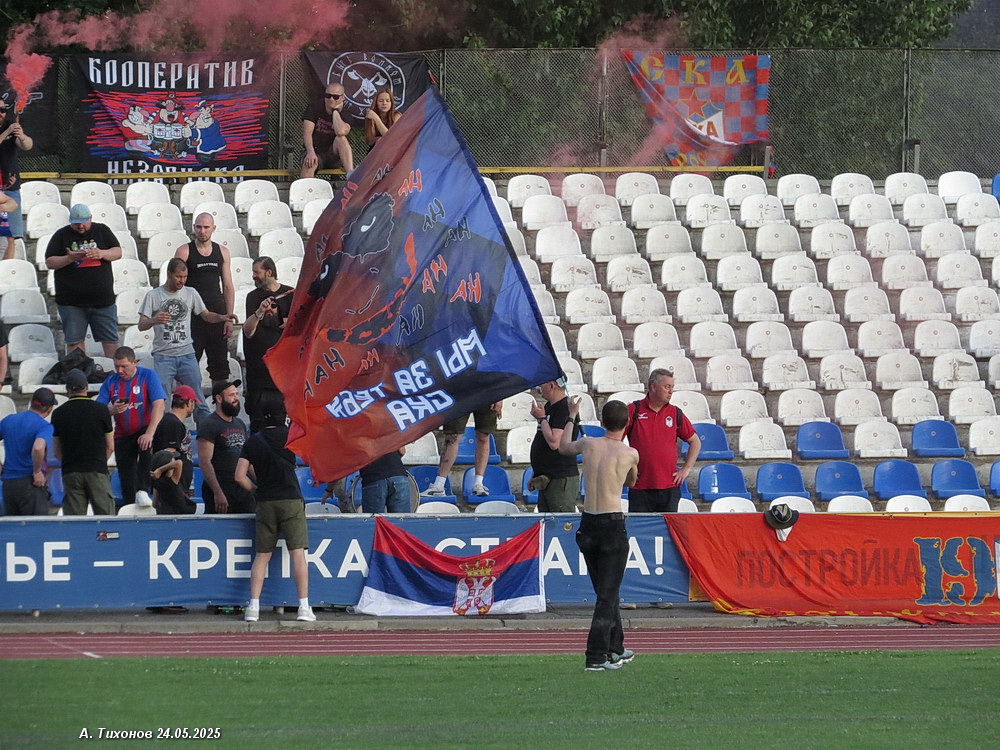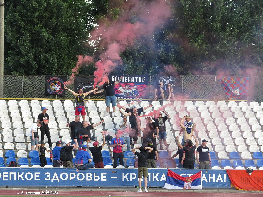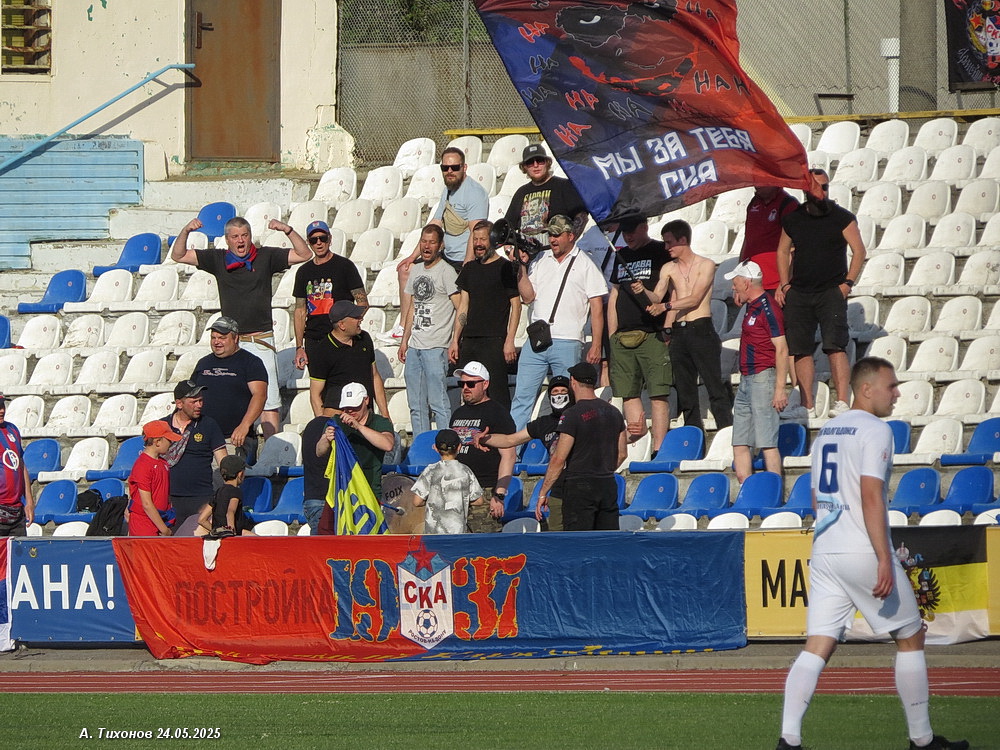 С началом второго активизировались не футболисты СКА, а их фанаты. Один из них с флагом СКА стал выбегать на футбольное поле. После второй такой «выходки» судья остановил матч и хотел уже увести команды с поля, но футболисты СКА сумели утихомирить не в меру ретивого фаната и игра возобновилась. Уже под конец матча несколько фанатов СКА пошли на нашу северную трибуну «выручать» свой флаг, который занёс туда всё тот же неугомонный ростовчанин. Вот вот могла разразится массовая потасовка, но всё же прибывшие чуть ранее двое полицейских по просьбе администрации вызвали подкрепление. Слава богу — всё обошлось без драки. А на поле в это время шёл разгром ростовчан. На 63 и 76 минутах Кучеев забивает ещё два мяча, Крамаров делает счёт 6:0, а наш капитан ставит победную точку на 83 минуте матча — 7:0! Победа и уверенное положение на первом месте в турнирной таблице.