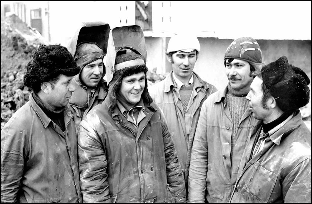 На снимке: одна из лучших бригад слесарей-сантехников СМУ-1 ДСК А. АВЕРКИН, И. КАШИН, В. БЛЯБЛИН, В РУДЕНКО, В. ПАНЧЕНКО, В.СЕМИЛЕТОВ — бригадир. Этот коллектив ударно трудится на строительстве жилья. Работы Здесь выполняют досрочно, с хорошим качеством.