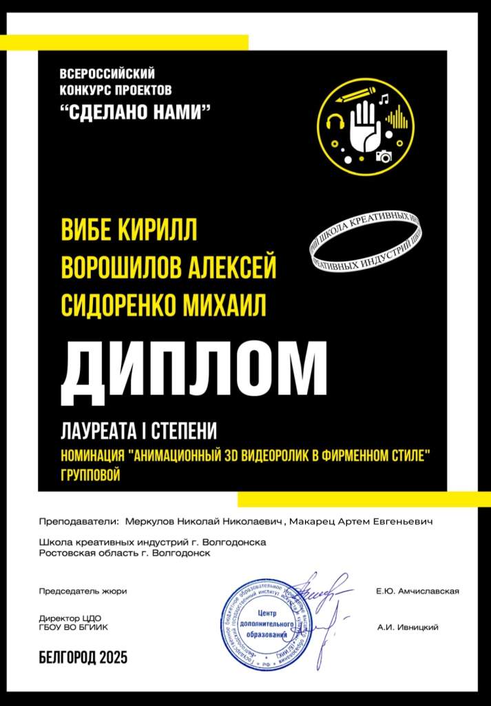 В Белгороде завершился II Всероссийский конкурс креативных проектов «Сделано Нами». В нём приняли участие Школы креативных индустрий со всей России. Было подано более 300 заявок, в том числе от Волгодонска. Это был первый межстудийный проект волгодонской ШКИ, представленный на конкурс такого ранга. И сразу успех: диплом лауреата I степени!