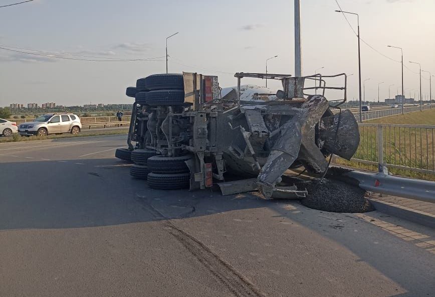 Сегодня вечером на разворотном кольце в районе дома по проспекту Лазоревому, 2 опрокинулся КамАЗ, перевозивший 9 тонн бетона. Водитель автомиксера не справился с управлением, и тяжелая машина легла набок, смяв отбойник. В ДТП пострадал пассажир КАМАЗа – его передали врачам.