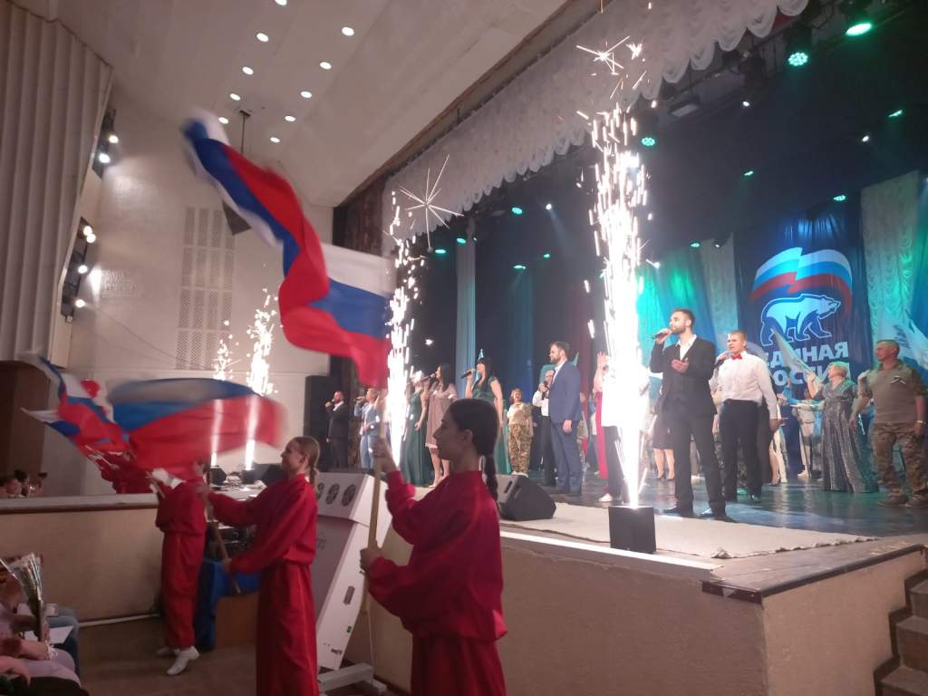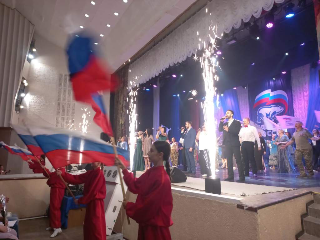 Завершающим аккордом стало общее исполнение песни «Россию не выбирают», наполнившей всех собравшихся чувством единства и общей любви к России. Во время исполнения песни с балкона второго этажа в зал посыпались сотни шаров цветов российского триколора.