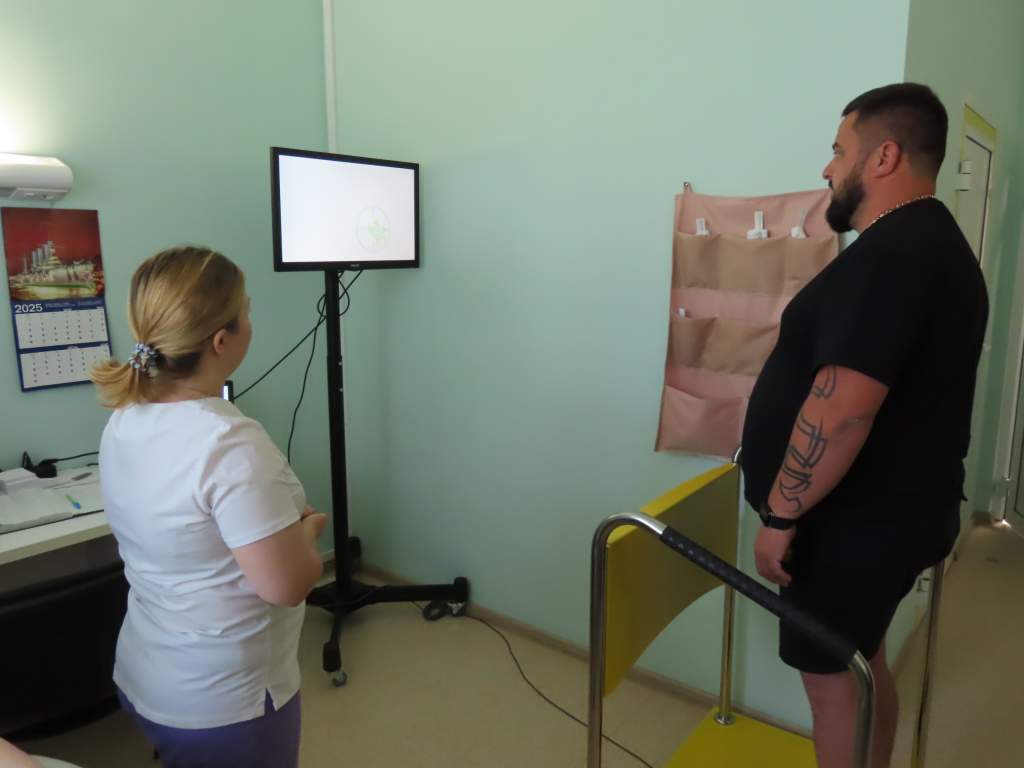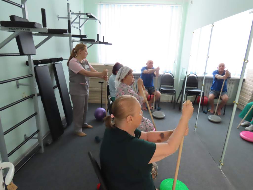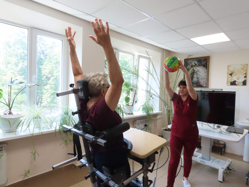 В отделении трудятся врач лечебной физкультуры и два инструктора, оборудован зал ЛФК. Два медицинских логопеда помогают пациентам не только с нарушениями речи, но и функциями глотания (это очень серьезная проблема для многих после инсульта). Два медицинских психолога придут на помощь при тревожном состоянии, депрессии, когда нарушена мелкая моторика, функции памяти и вестибулярного аппарата. Теперь здесь есть и специалист-эрготерапевт. Он помогает пациенту научиться выполнять привычные действия, которые он раньше делал, даже не задумываясь – например, держать чашку или чистить зубы. В целом с больным одновременно могут заниматься до четырех медработников.