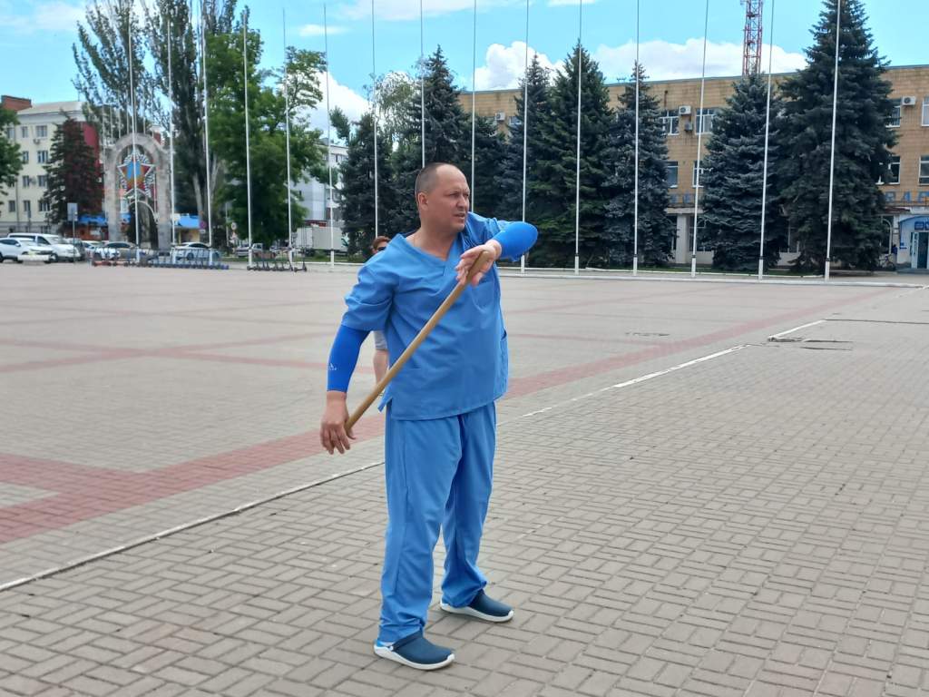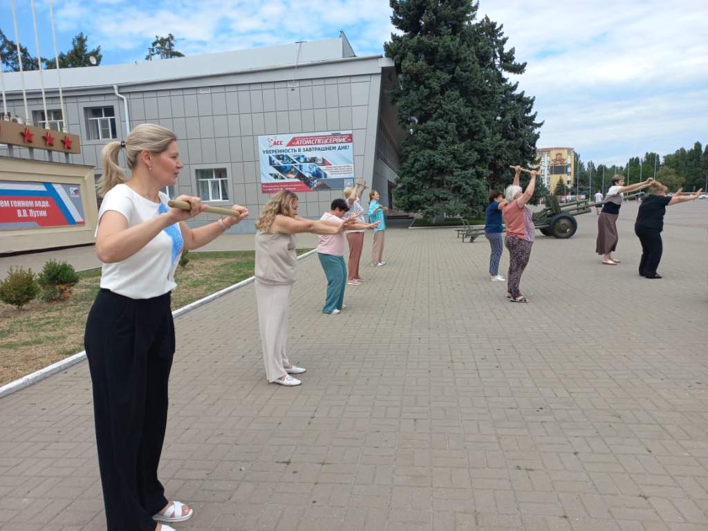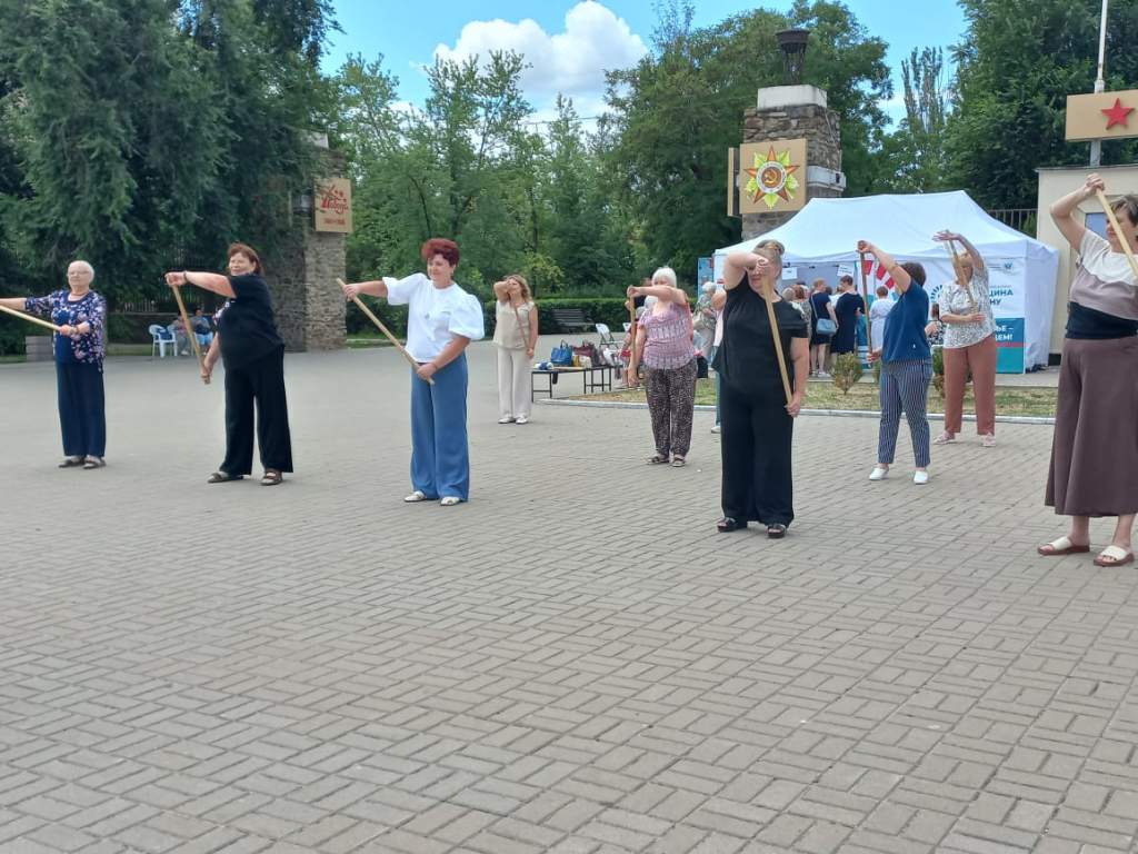 Инструктор ЛФК Андрей Удеревский провел с горожанами занятие с гимнастической палкой, объяснил, как укрепить мышцы спины и улучшить осанку.