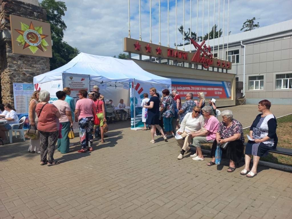 Первый день работы мобильного медицинского пункта прошел у входа в парк Победы со стороны почтамта. На площади Победы разместилась большая медицинская палатка с импровизированной регистратурой, где записывали данные всех желающих пройти обследование.