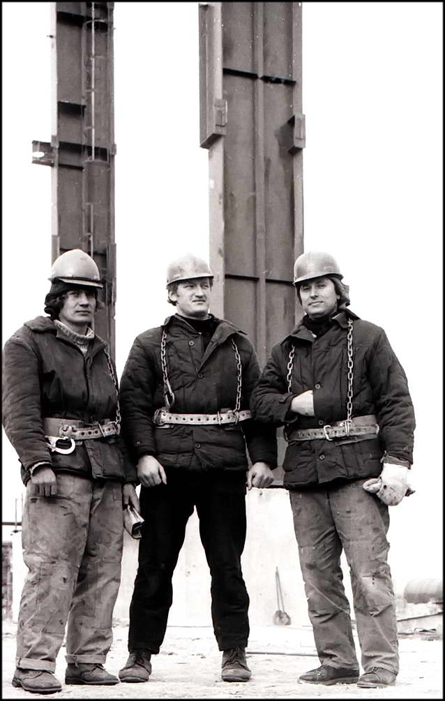 На снимке: монтажники В. МОРОЗОВ, А. КОСТИН и бригадир А. АСТАХОВ.