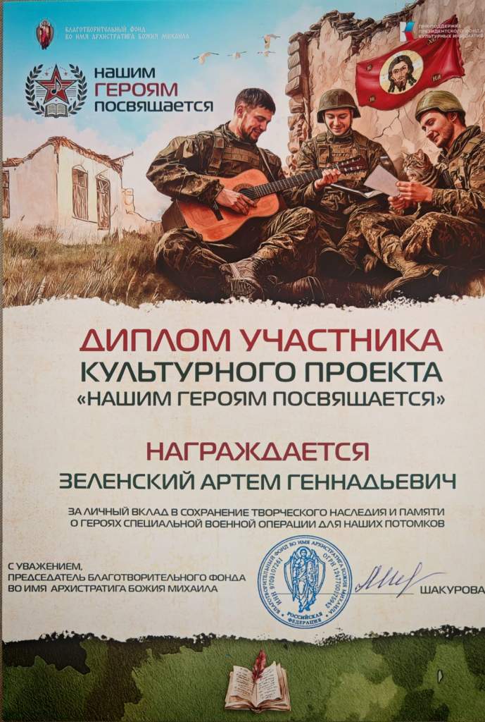 Чтобы стать участником этого масштабного Всероссийского проекта, воспитанник преподавателя ДМШ имени Рахманинова Владимира Столярова по классу гитары успешно прошёл сложный конкурсный отбор, отправив видеозапись со своей авторской песней «Северный флот». Её исполнение на сцене вызвало глубокие эмоции у зрителей и создало в зале атмосферу единства и безмерной поддержки. За свои волонтерские заслуги, активную гражданскую позицию и вклад в развитие общества Артём Зеленский был удостоен медали.