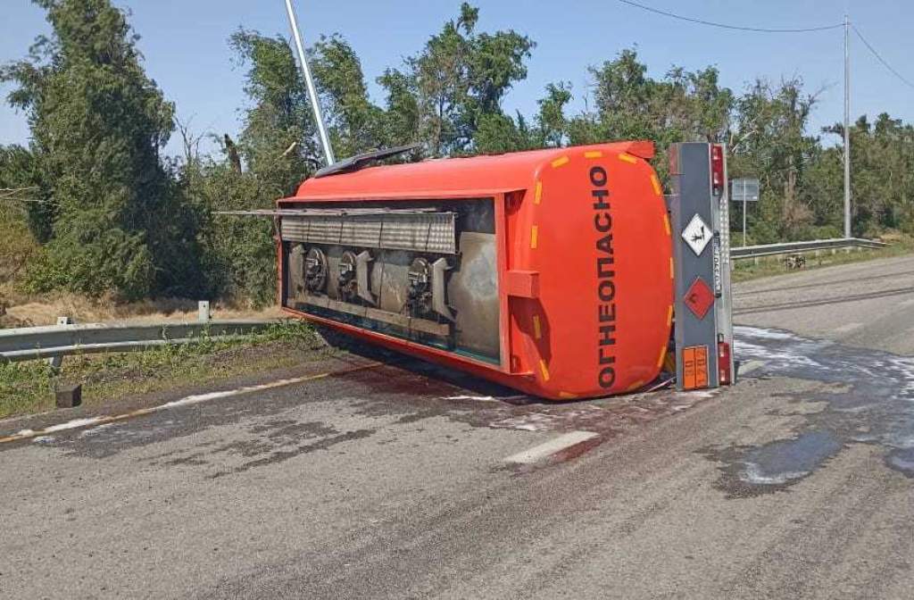 На Романовском шоссе опрокинулась цистерна бензовоза. Движение перекрыто