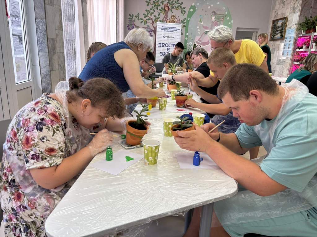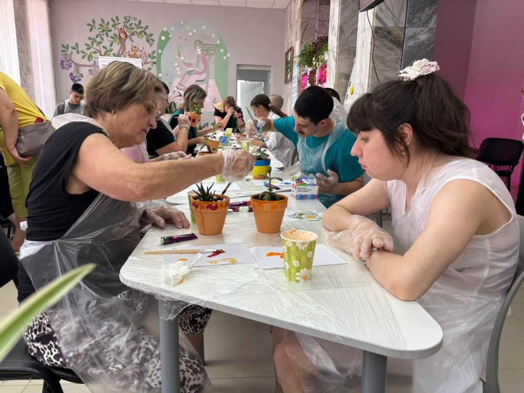 Молодые люди с особенностями здоровья учились пересаживать домашние цветы, выращенные в мастерской «Я — садовод», и расписывать кашпо. Маленькое растение стало символом того, как забота и терпение помогают расти — и цветку, и человеку.