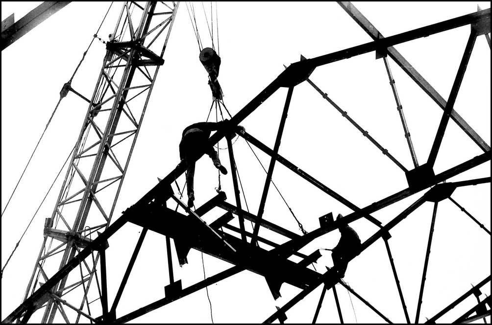 Монтажники МУ-27 «Спецстальконструкции» М.Д. ШЕВЧЕНКО и В. Н. ЩЕРБАНЬ (на снимке) на укрупнении блоков покрытия корпуса № 4 «Атоммаша» показывают высокое качество сборки.