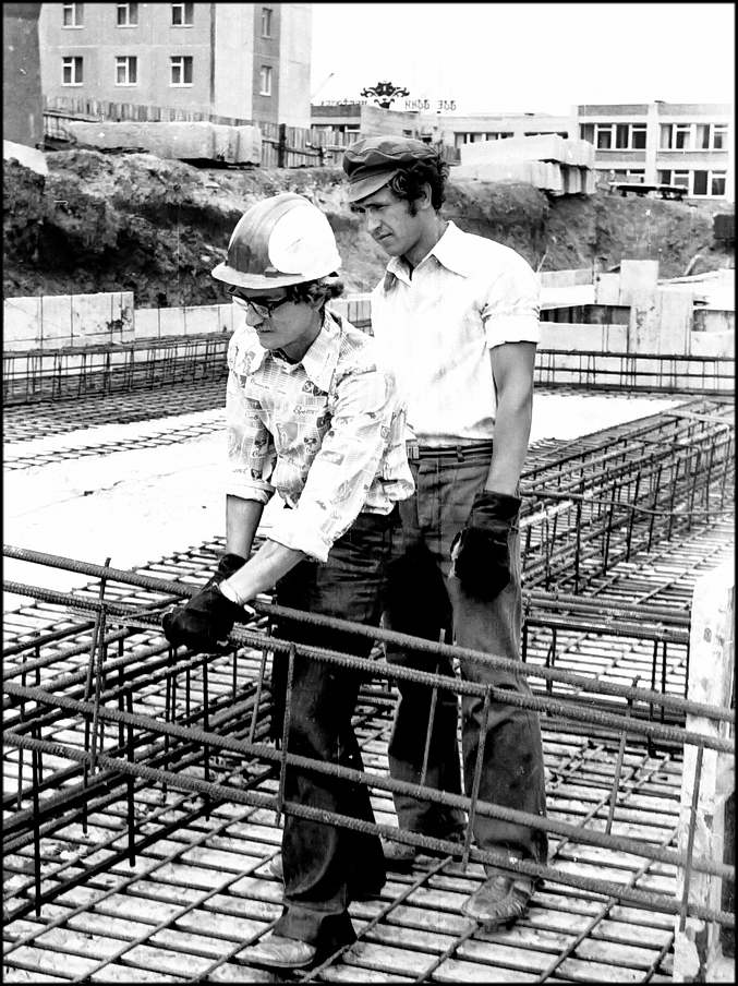 Быстро и слаженно работают на армировании фундамента дома № 17 в юго-западном районе города плотники-бетонщнки бригады Ф.А.Небыкова из СУ-31 «Главсевкавстроя» В.В.Сатлер и А.И. Косевцов. Работая добросовестно, они выполняют задания с хорошим качеством. На снимке: В. В. САТЛЕР и А. И. КОСЕВЦОВ за работой.