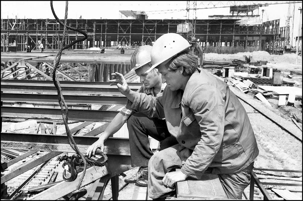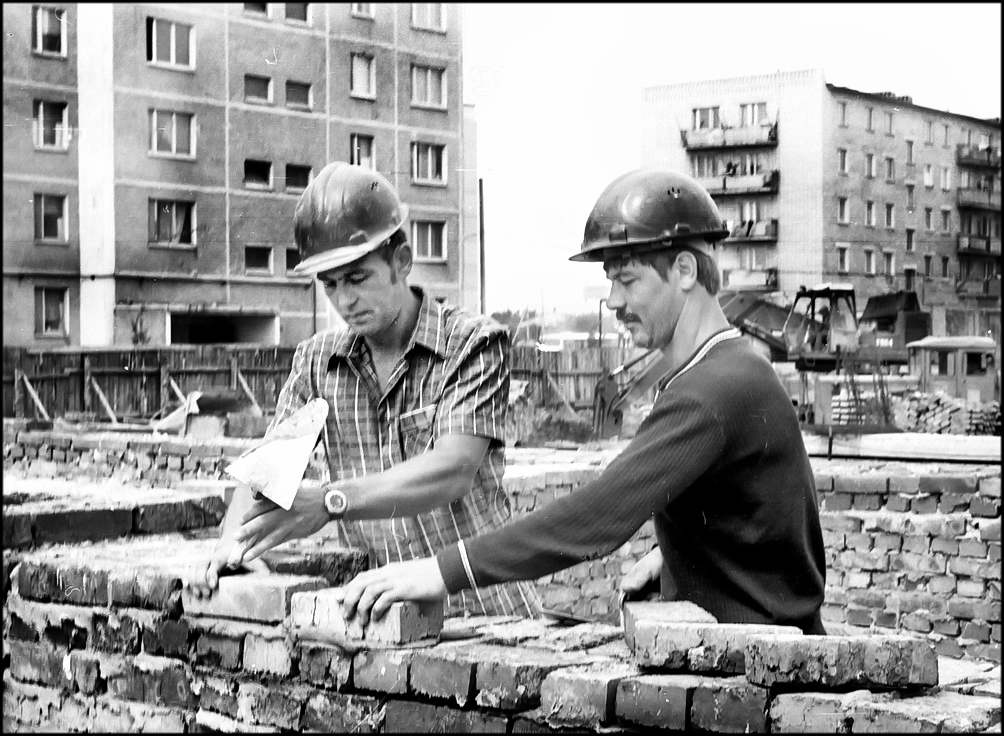 Второй год работают в бригаде каменщиков, возглавляемой В.Ф.Кичиком из СУ-31, М.А .СТРОГАНОВ и В.А.ВЕРЧЕНКО (на снимке). Быстрота и слаженность в работе позволяют им добиваться высоких результатов . Занятые на кладке стен второй очереди жилого дома № 7, они постоянно перевыполняют сменные задания.