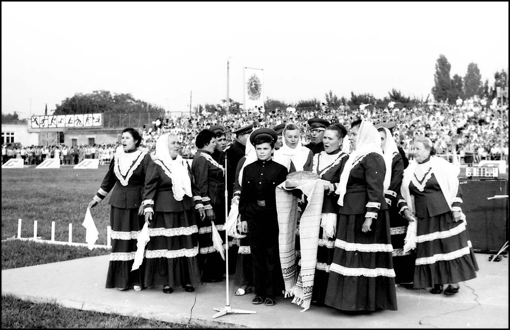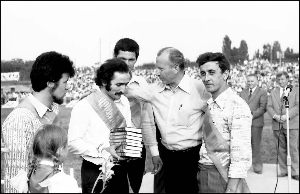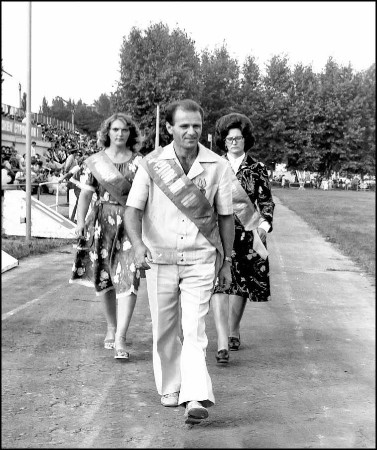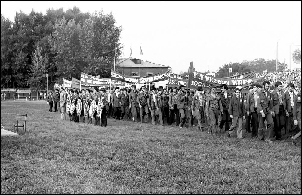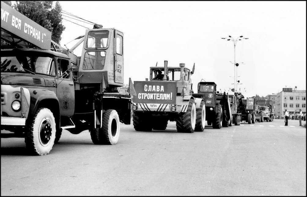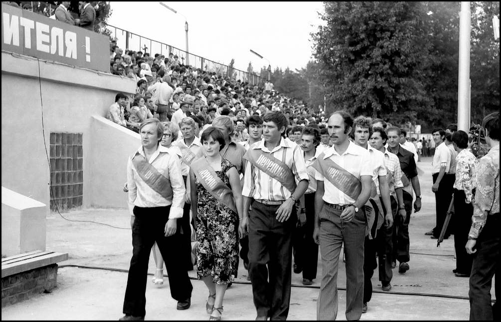 Вдруг зеленое поле украсилось словно цветами, детскими фигурками. Девочки, воспитанницы пионерского лагеря «Маяк», в разноцветных платьицах под песенку «Улыбка» делают упражнения. Выстраиваемые ими композиции славят труд и мир. На стадион въезжает колонна машин с передовиками производства. На машинах лучшие из лучших: бригадиры И. В. Кудинов с бетонного завода, В.В.Бавыкин и Н.Т. Тарасов из «Заводстроя» В.В.Шкляев из «Промстроя-1». Г.И. Ярмолюк из УПТК, С.Ф. Плужников, А.А,Вербицкая, A.И.Терещенко из «Жилстроя» и многие другие, чьими именами славна стройка. Есть среди них и миллионеры — бригадиры А.А.Аношкин и В.В.Сергеев из «Юж стальконструкции», коллективы которых ко Дню строителя произвели строймонтажных работ более, чем на миллион рублей каждый. Есть здесь и прославленные водители. 3200 автомобилей обслуживают сегодня гигантскую стройку. Наибольшей эффективности использования машин добились А.Г.Петрученко, B. Первичко, А.А. Зисе, Г.А.Бунин . Всех их горячо приветствуют трибуны. Во главе колонны передовиков — экспорт мотоциклистов с Красными знаменами. Знамя обкома КПСС, облисполкома, обл совпрофа и обкома комсомола доверено нести и установить на флагшток кавалеру орденов Ленина и Трудового Красного Знамени бригадиру кровельщиков «Спецпромстроя» А.К.Тихонову.