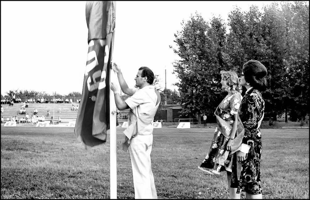 С зажженным факелом Н.И. Каминский направляется в центр стадиона, где сооружена больш я стальная чаша. Вспыхивает огонь праздника. Флаг праздника поднимают передовой бригадир плотников-бетоншиков «Заводстроя» Л.П.Куракин и победители соревнования на звание «Лучший молодой строитель» газосварщ ица Н. Науменко и штукатур Н. Волосович из треста « Волгодонскэнергострой».