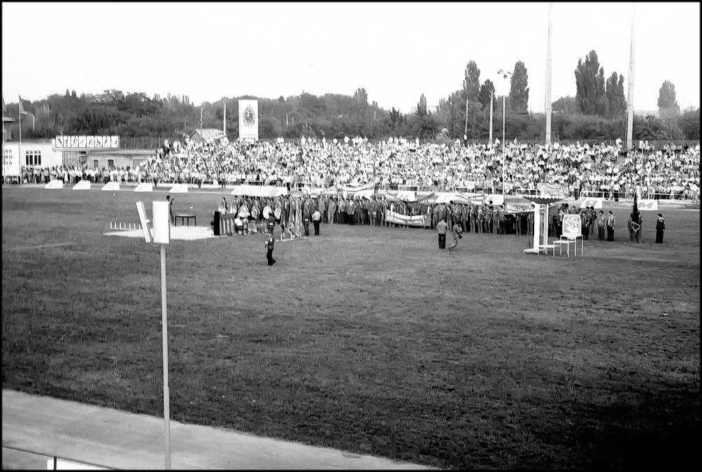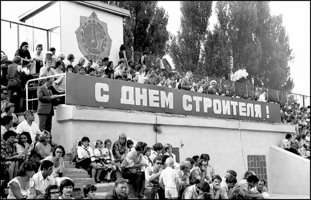 Колонна машин и колонна передовиков двинулись на стадион «Строитель». Там состоится торжественное открытие праздника. Трибуны стадиона заполнены до отказа. На центральной трибуне — руководители города, строительных организаций, предприятий, гости Волгодонска.