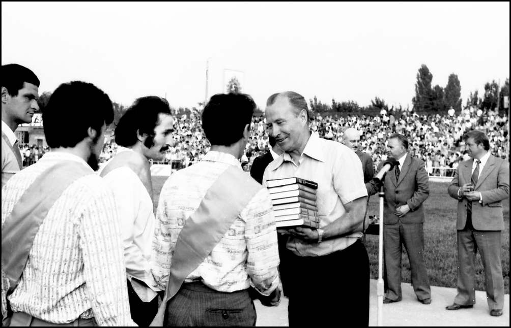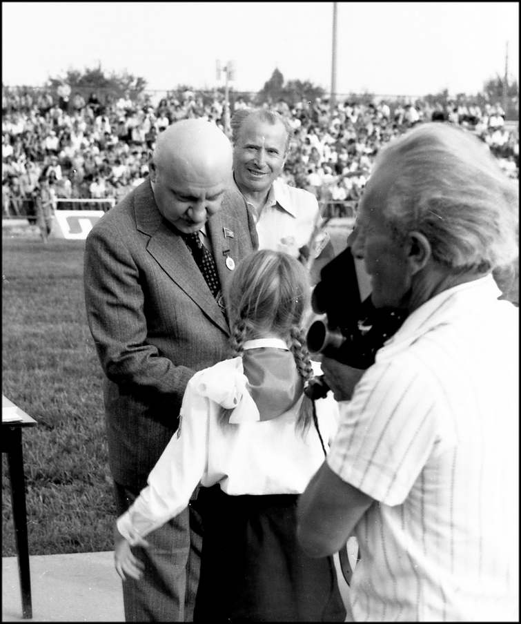 Гостей — много — группа артистов кино во главе с первым секретарем правления Союза кинематографистов СССР, народным артистом СССР Л.А.Кулиджановым, представительная делегация журнала «Огонек». Узнавая любимых актеров, стадион бурно аплодирует.