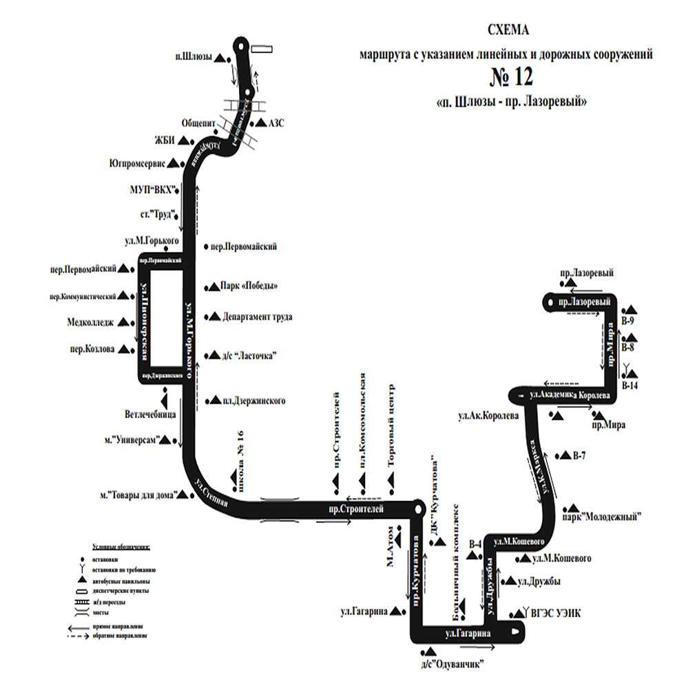 Теперь схема выглядит так. Поселок Шлюзы – Горького (Пионерская) – путепровод – Строителей – Курчатова (остановка «ДК «Курчатова») – Гагарина (через БСМП) – Дружбы – Кошевого – К. Маркса (В-7) – Королева – Мира (В-8, В-9) – Лазоревый. Обратите внимание, что из схемы исключены остановки «Сквер Дружбы», «Пиццерия «Камин», «Лабораторный корпус», «АБК-1», «Медсанчасть», «Автоцентр». Остановки «Мебельный центр» и «Детский сад «Одуванчик» остаются – по требованию пассажиров.