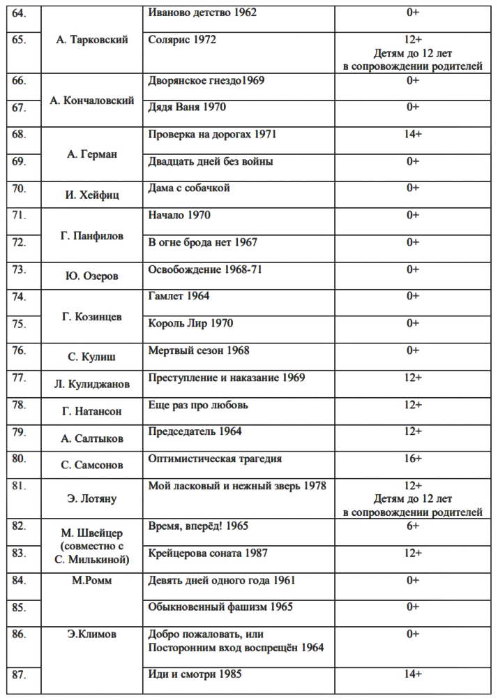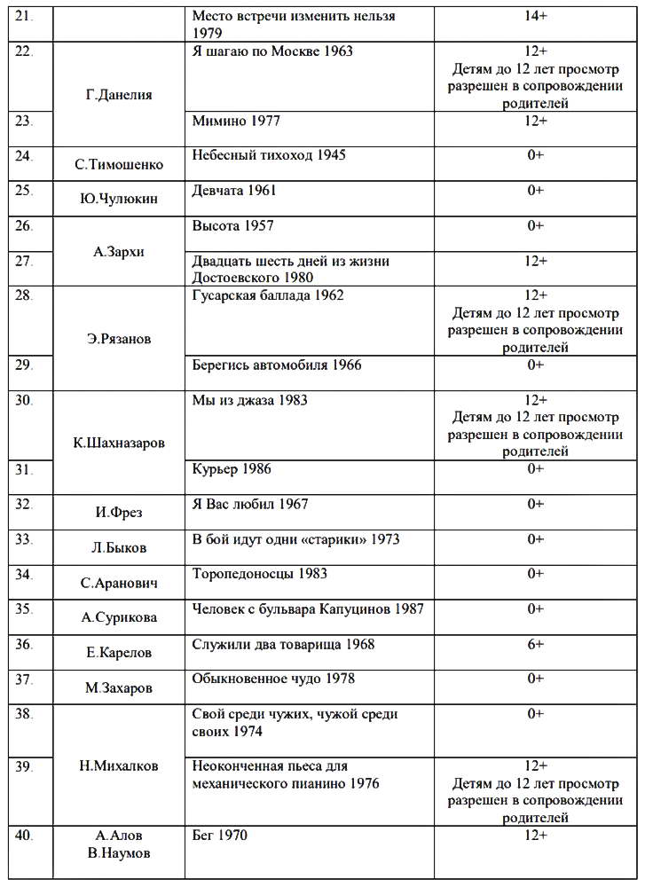 Действительно, к каждому фильму в списке есть своя маркировка — от 0+ до 16+. У некоторых, например, таких как «Гусарская баллада» (1962 г.), «Вий» (1967 г.), «Экипаж» (1979 г.), при пометке 12+ стоит уточнение: «Детям до 12 лет просмотр разрешен в сопровождении родителей».