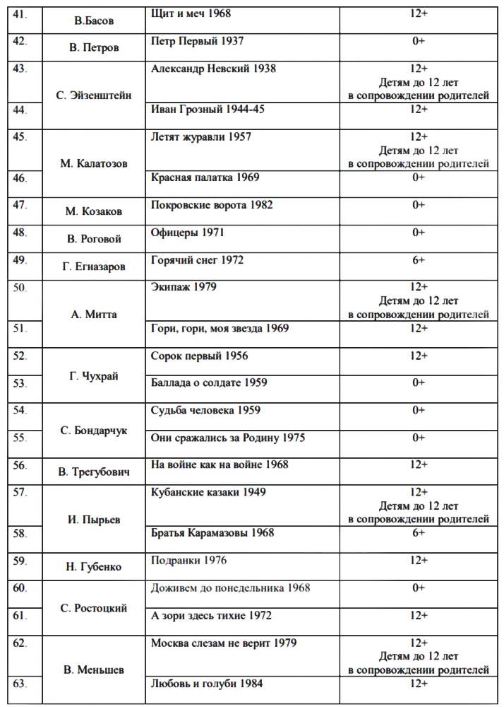 «В перечень… включены фильмы из «золотой коллекции» отечественного киноискусства, созданные до 1992 года, так как картины этого периода были сняты выдающимися режиссерами, чей авторитет, мастерство, художественный и творческий уровень прошли проверку временем. Перечень 100 фильмов составлен с учетом возрастных категорий», — отмечается в рекомендациях.