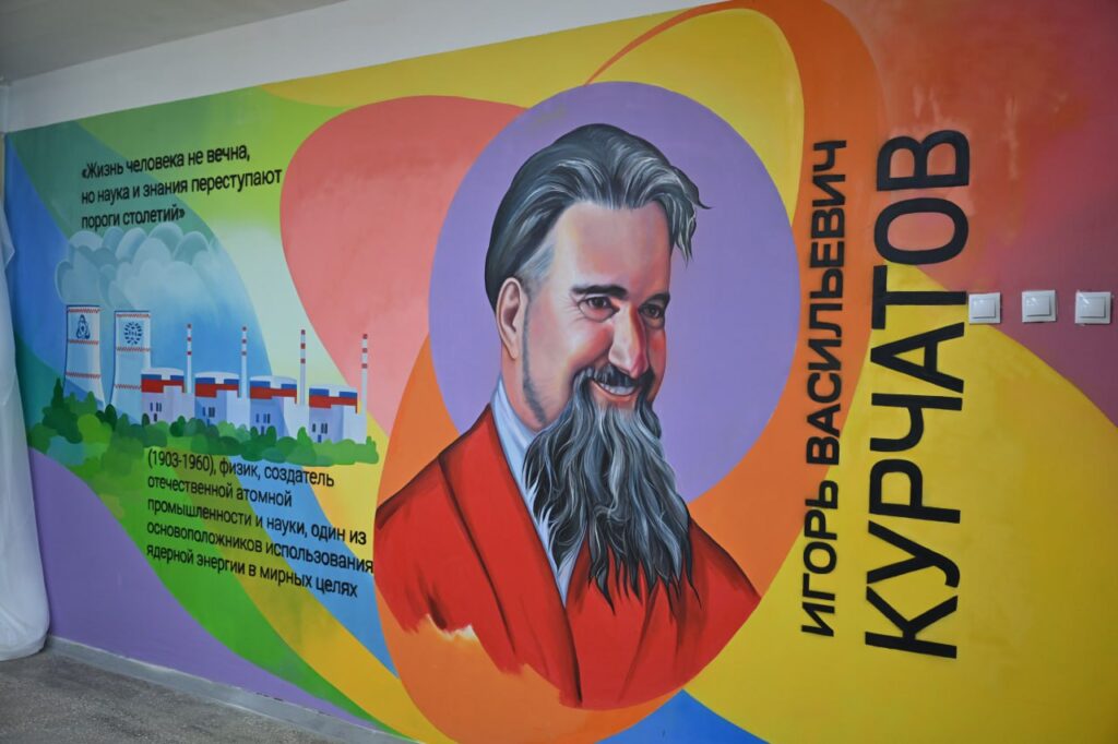 В День знаний учеников школы № 21 — одной из подшефных школ Ростовской АЭС — встретило огромное живописное панно, посвященное академику Игорю Васильевичу Курчатову, руководителю атомного проекта СССР, и 80-летию атомной промышленности.