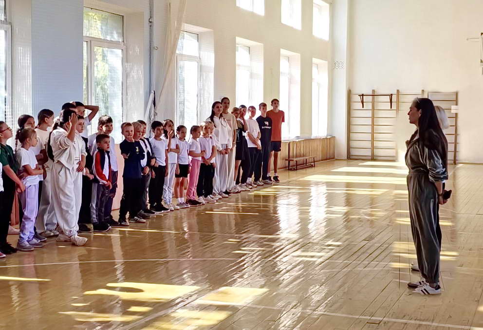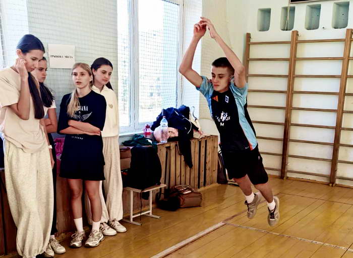Спортивный зал был подготовлен для тестирования, где более 70 учащихся из первых-десятых классов продемонстрировали свои физические способности. Испытания охватывали несколько видов упражнений, включая подтягивания из виса на высокой перекладине, сгибания и разгибания рук в упоре лежа на полу, а также подтягивания из виса на низкой перекладине, расположенной на высоте 90 см. Учащиеся также выполняли наклоны вперед из положения стоя с прямыми ногами на гимнастической скамье, прыжки в длину с места толчком двумя ногами и поднимание туловища из положения лежа на спине.