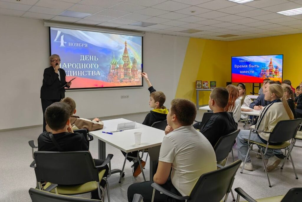 В честь Дня народного единства в модельной центральной библиотеке состоялась интеллектуальная квиз-игра «Время быть вместе» для учащихся пятых классов Центра образования. Пять команд соревновались в пяти турах. Ребята отвечали на вопросы об истории праздника, о символике и народах нашей страны, добавляли пропущенные слова в текст Гимна, расшифровывали загаданные пословицы о нашей Родине.