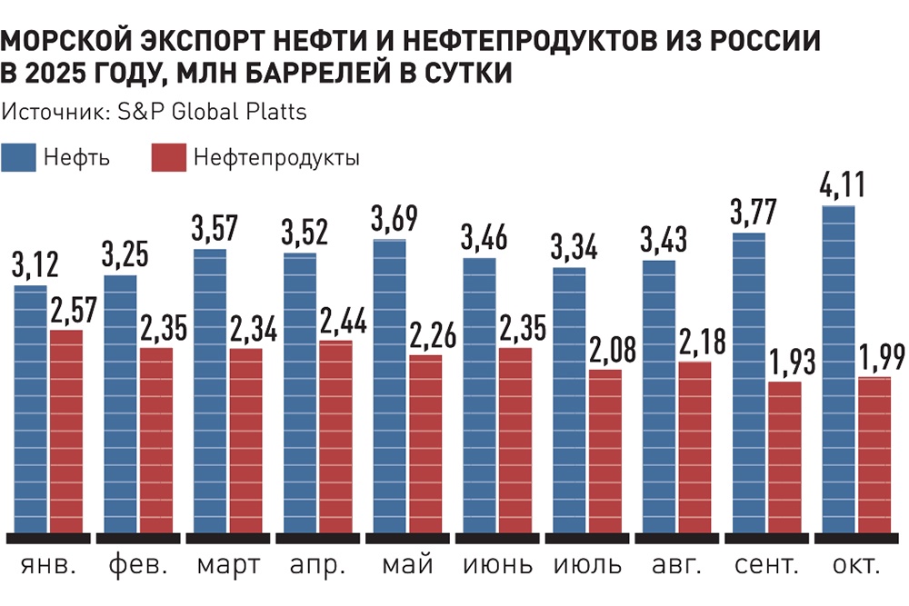 В октябре морской экспорт нефти из России вырос на 9% по сравнению с предыдущим месяцем и составил 4,11 млн баррелей в сутки. Это рекордный показатель с января 2022 года. Такие данные приводит S&P Global Platts.